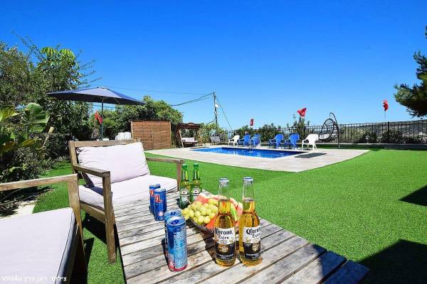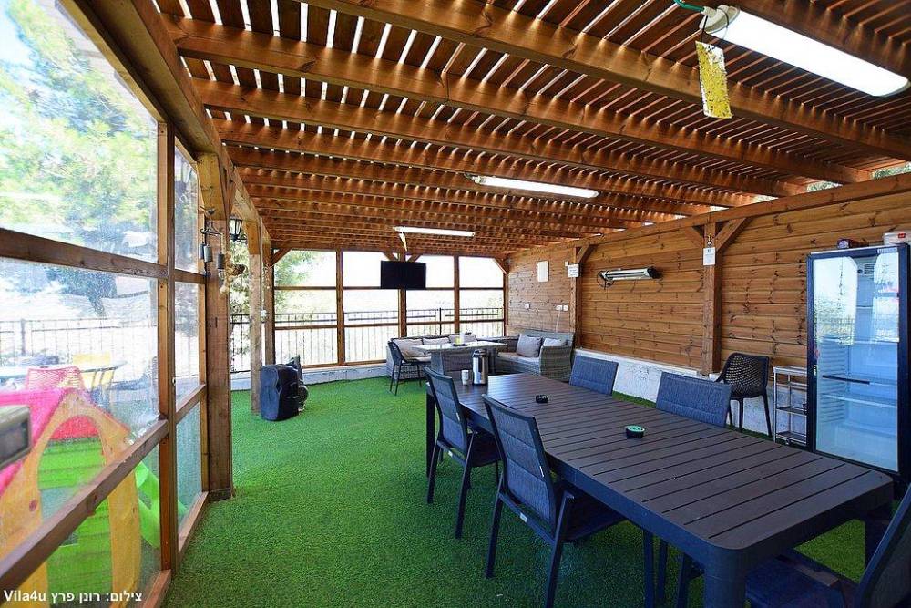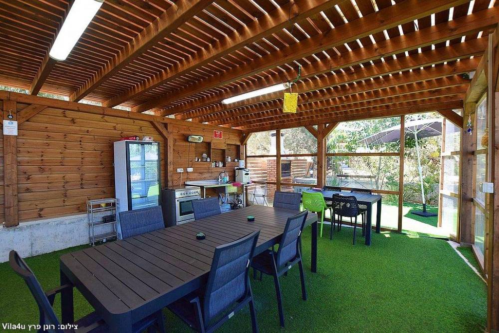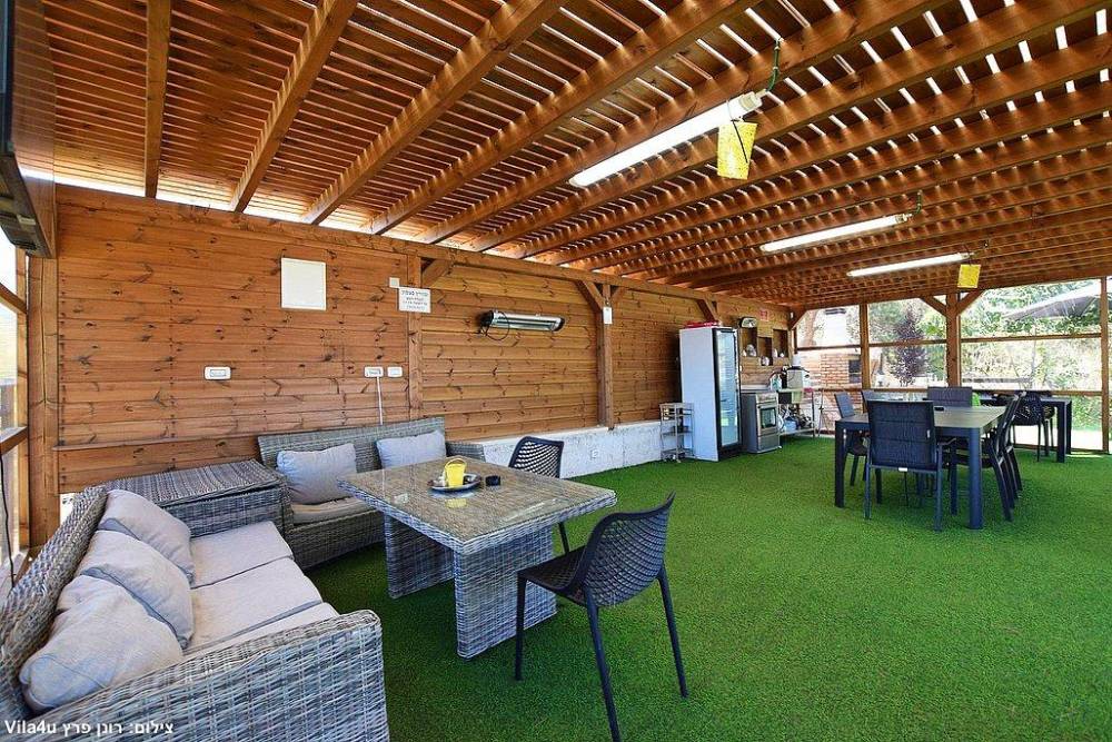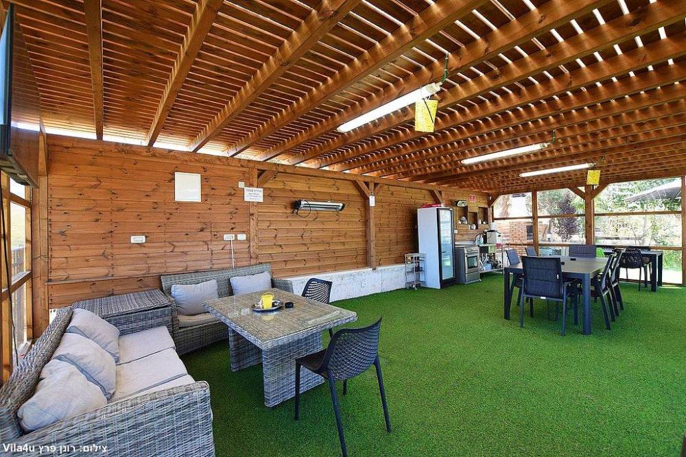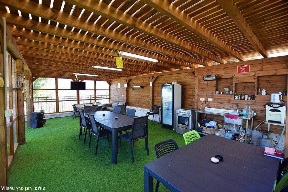 - מטבח חוץ גדול הכולל: מקרר, מקפיא, תנור אפייה, כיריים גז, קומקום חשמלי, כלי אוכל והגשה, מתקן מים