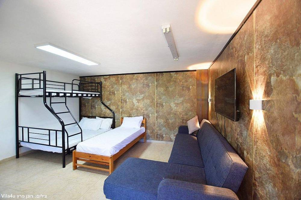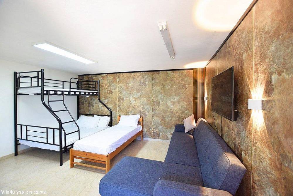בכל צימר: חדר שינה עם מיטה זוגית, ספות נפתחות, מיטת קומותיים לילדים