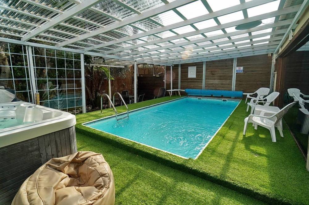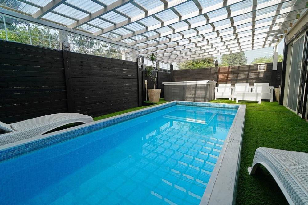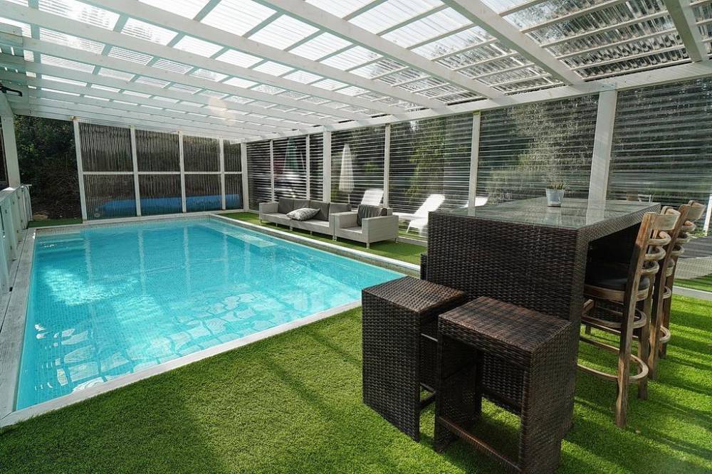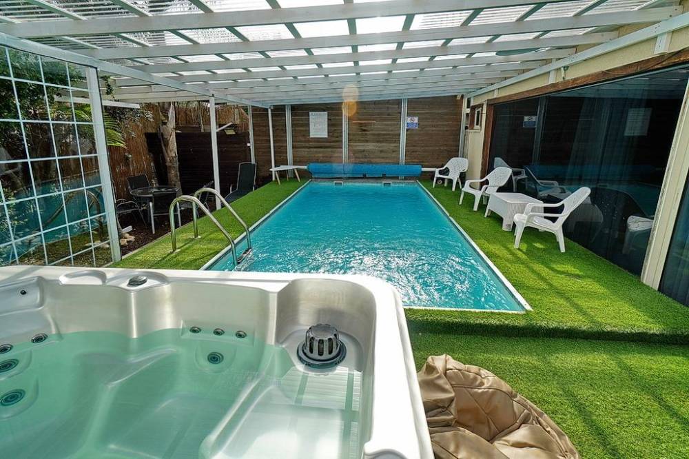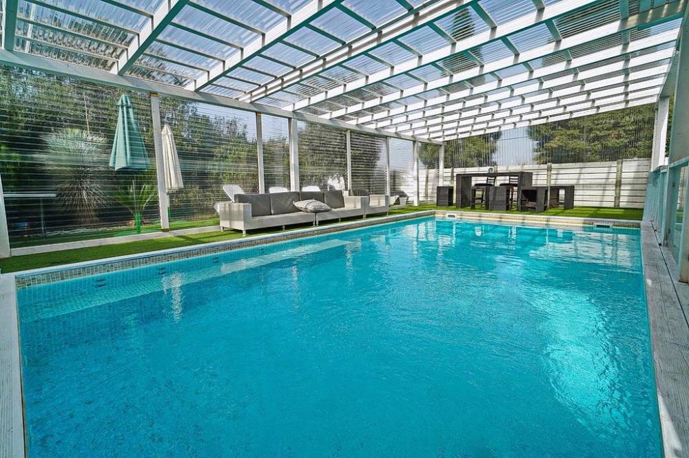 בריכת שחייה פרטית מחוממת ומקורה עם מיטות שיזוף