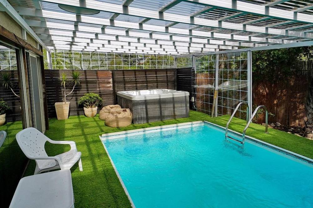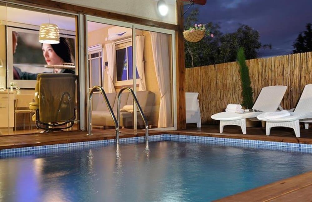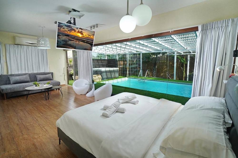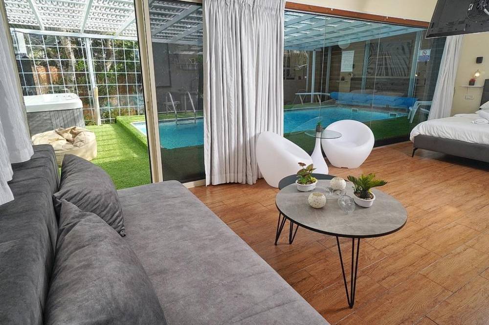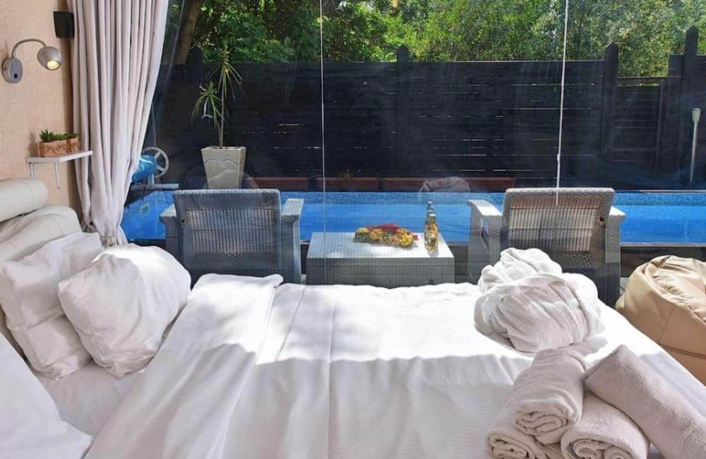 בריכת שחייה פרטית מחוממת ומקורה עם מיטות שיזוף