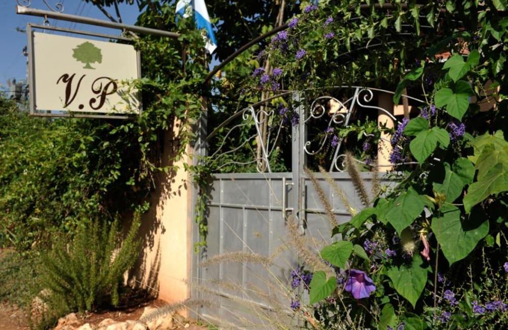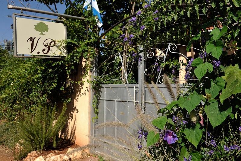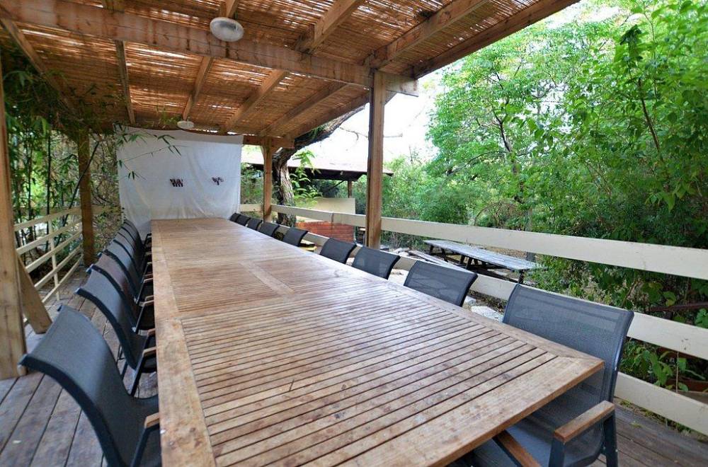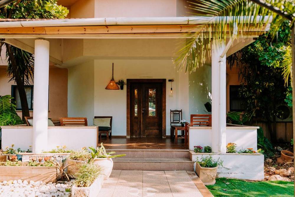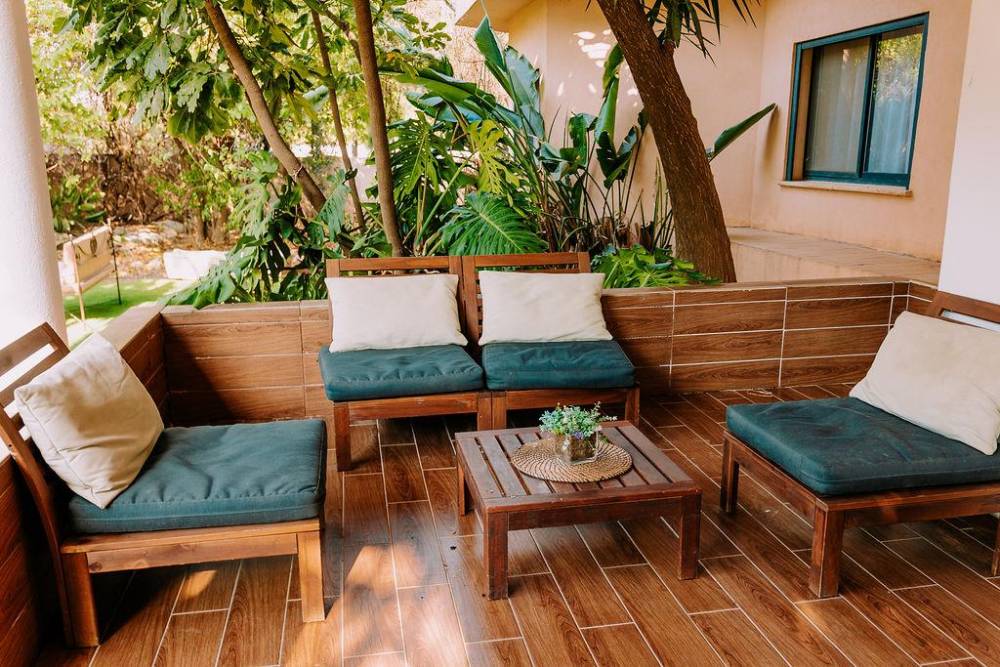 חצר המוקפת בצמחייה יפיפייה עם עצי גפן ופסיפלורה