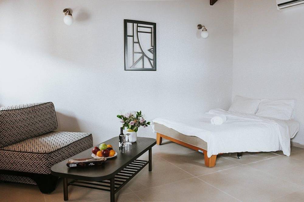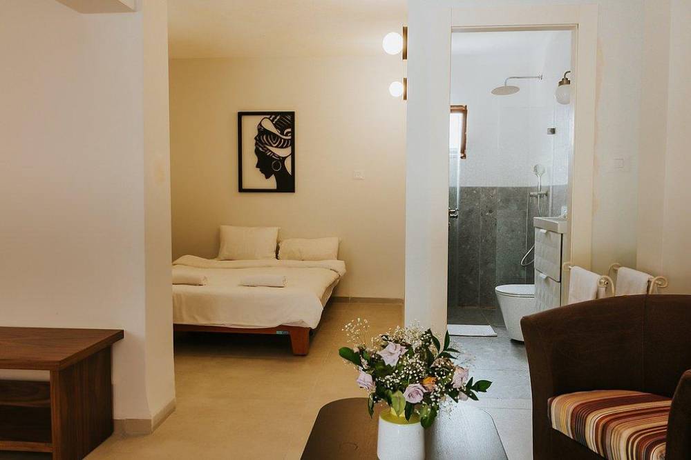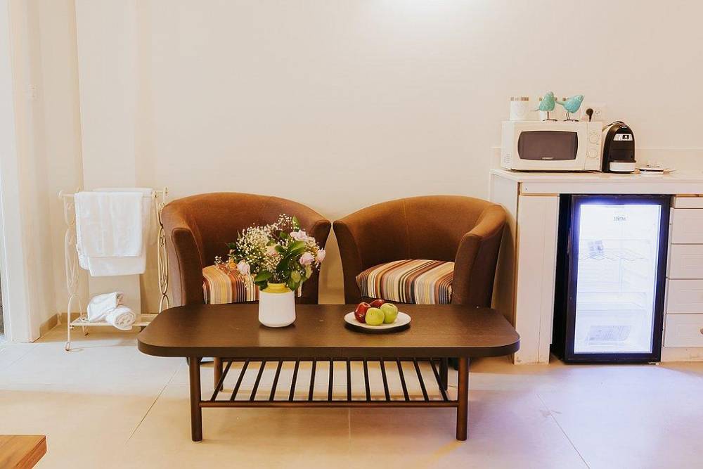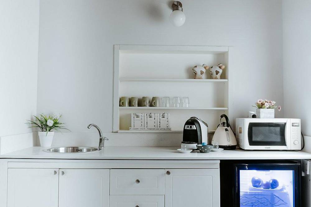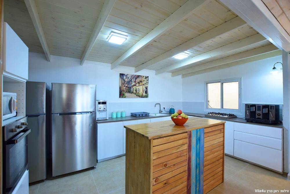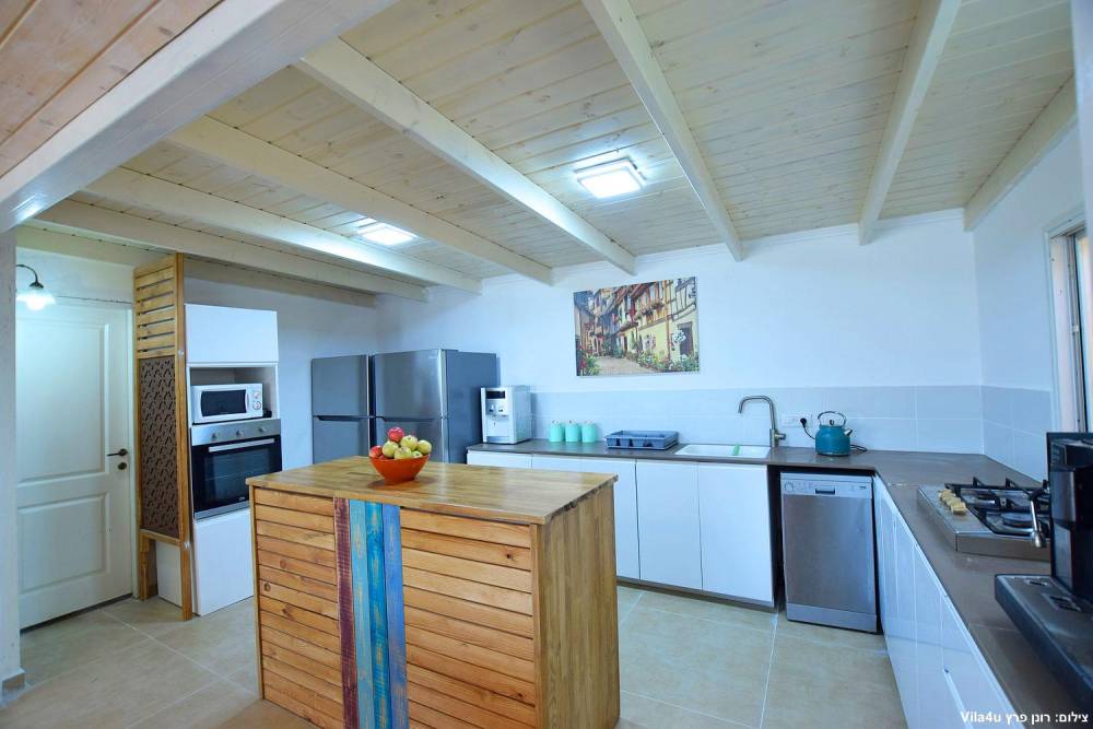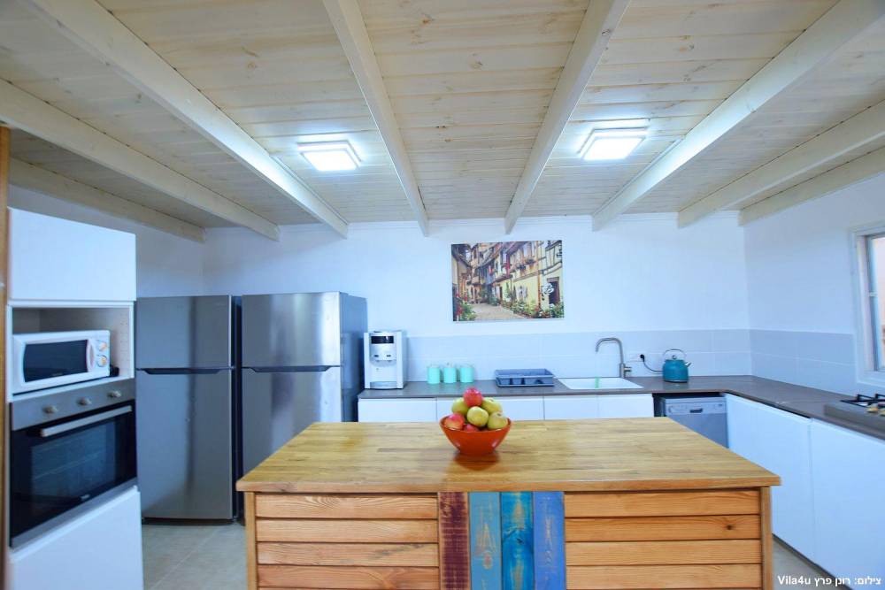 מטבחון מאובזר הכולל: מיקרוגל, מקרר, מכונת אספרסו + קפסולות, יין עוגיות, פירות, קפה תה סוכר, חלב, מיץ טבעי