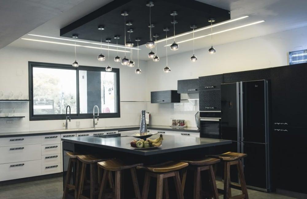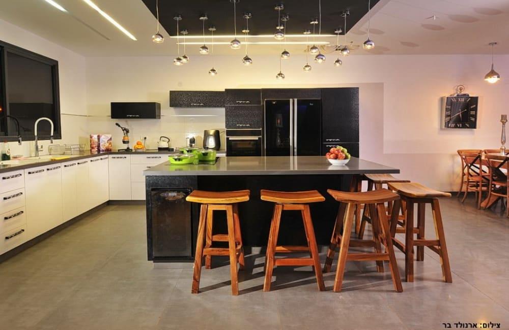 מטבח מאובזר עם מקרר ענק ומגוון מוצרי חשמל לשימוש האורחים