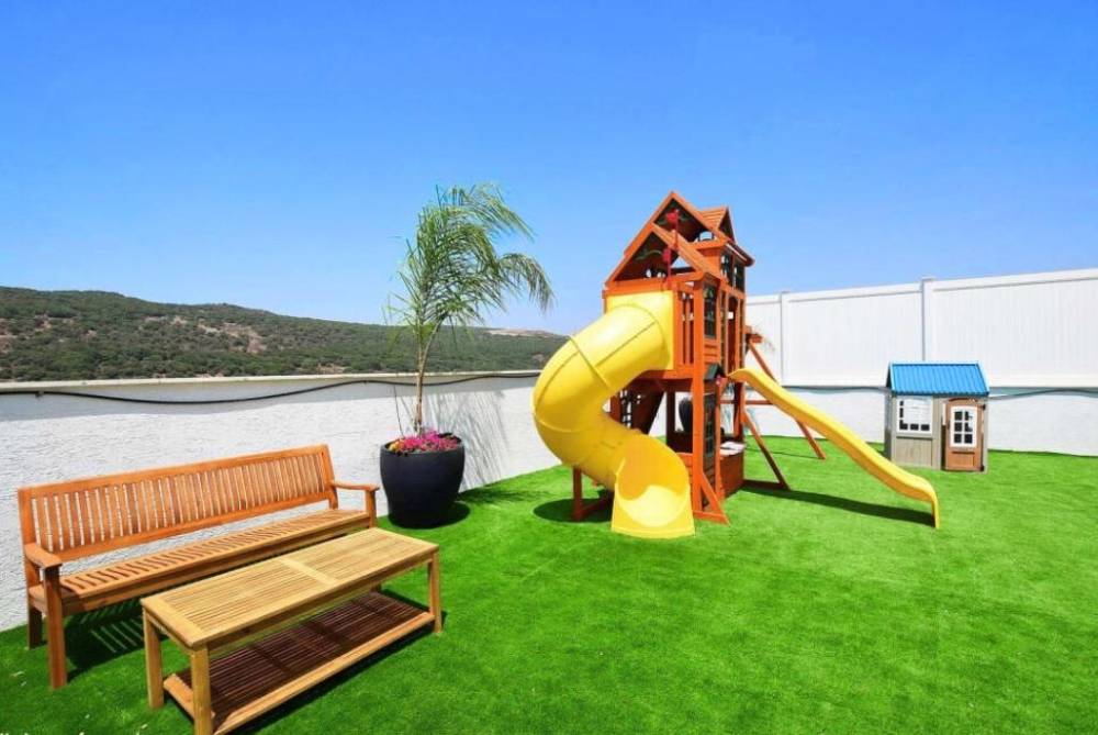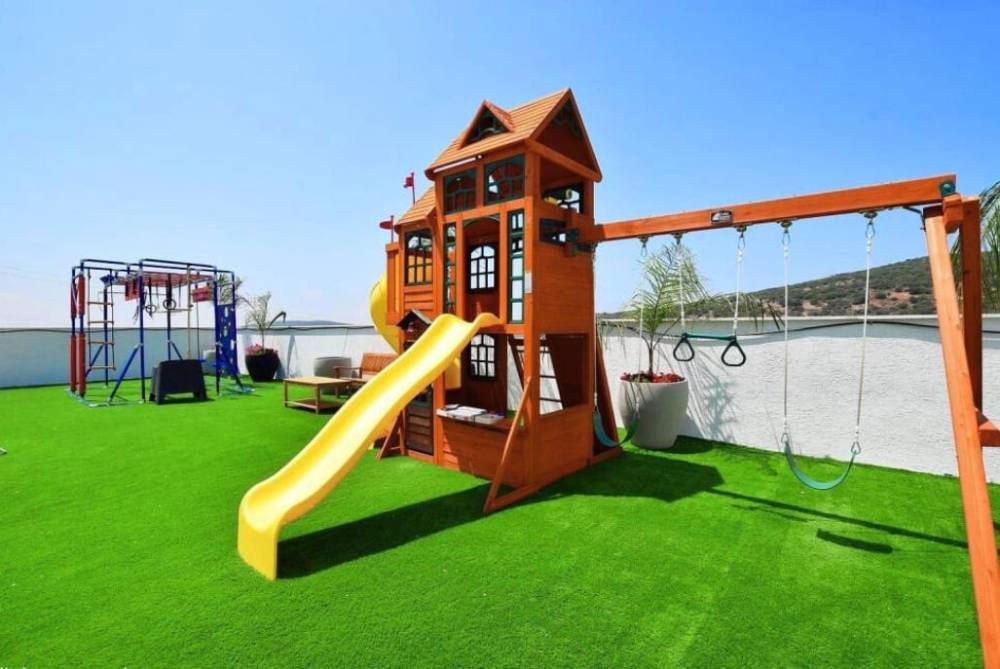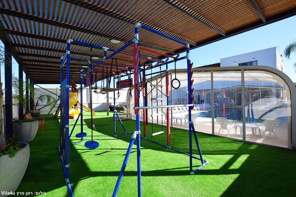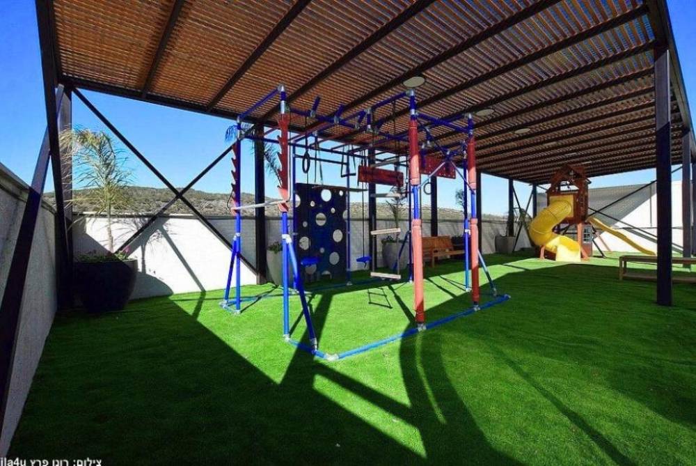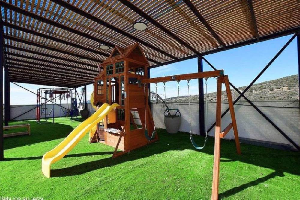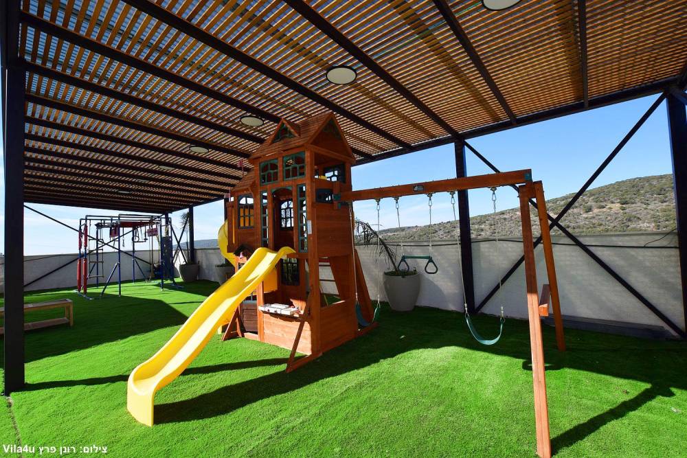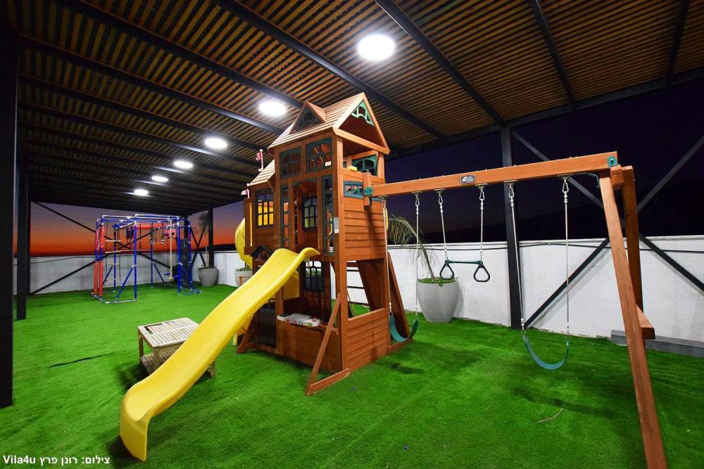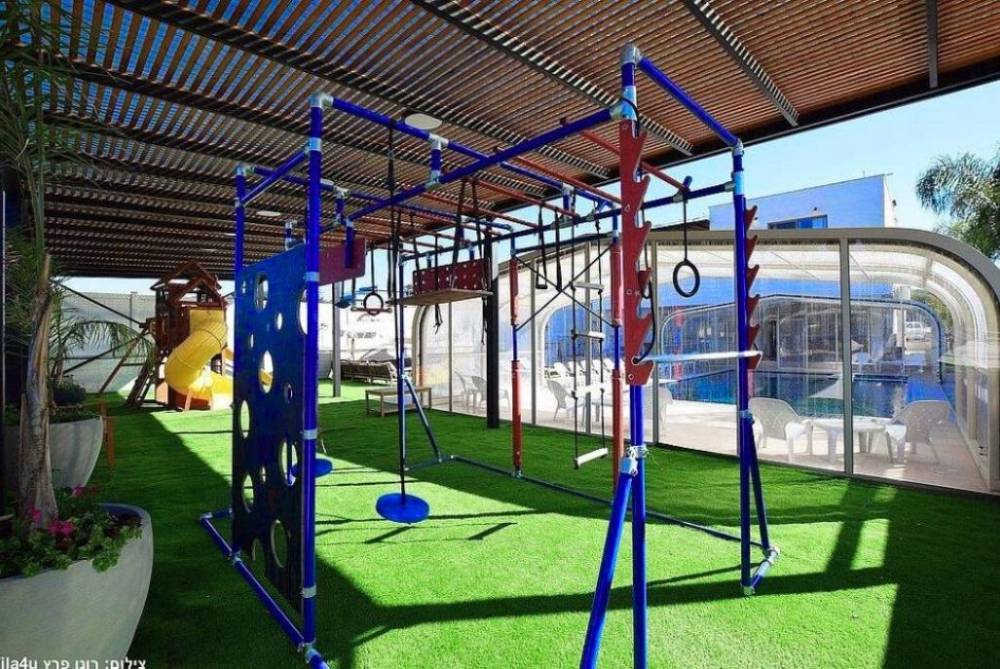 מתחם משחקים לילדים הכולל - בית משחקים, מגלשות, מתקן נינג'ה, נדנדות ועוד.