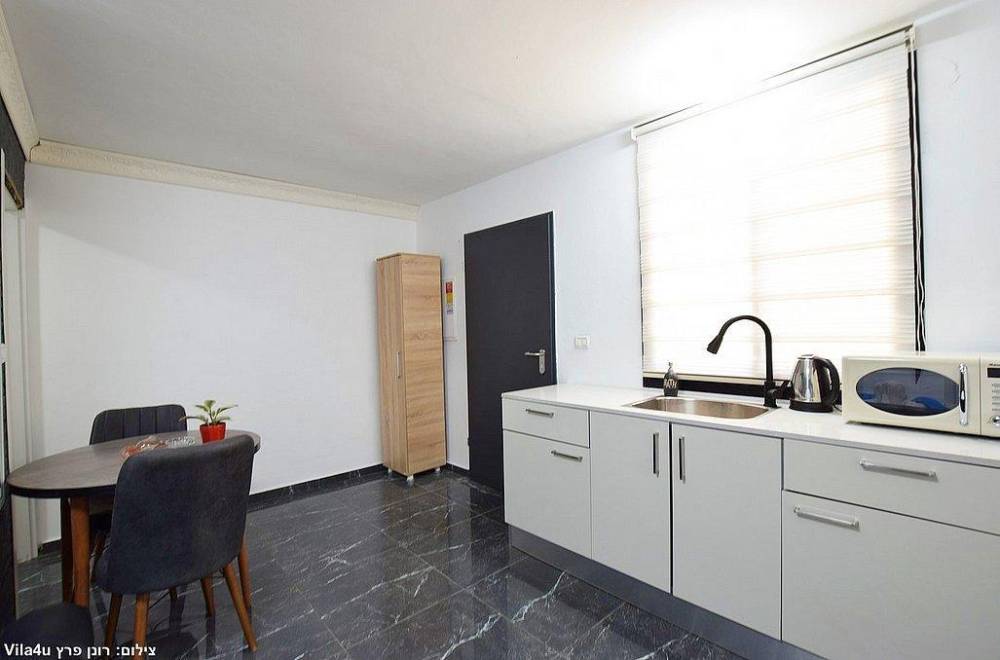 מטבח מרכזי גדול הכולל: מקרר, מיקרוגל, קומקום חשמלי, כיריים חשמליות, כלי אוכל והגשה, תנור אפייה