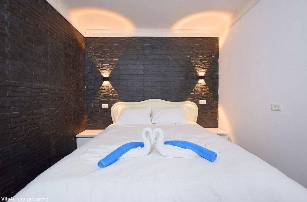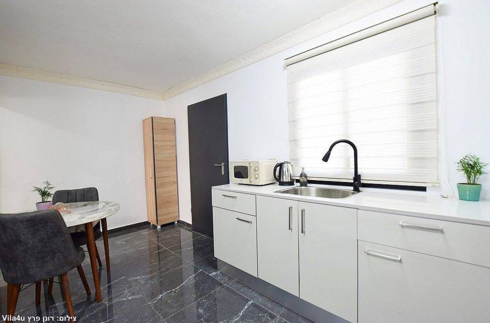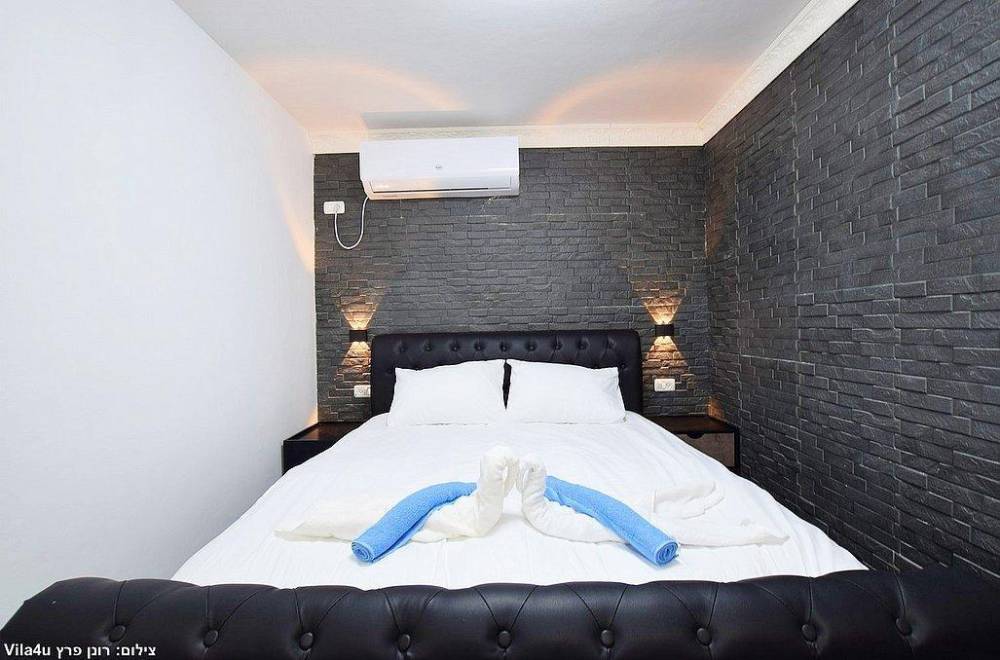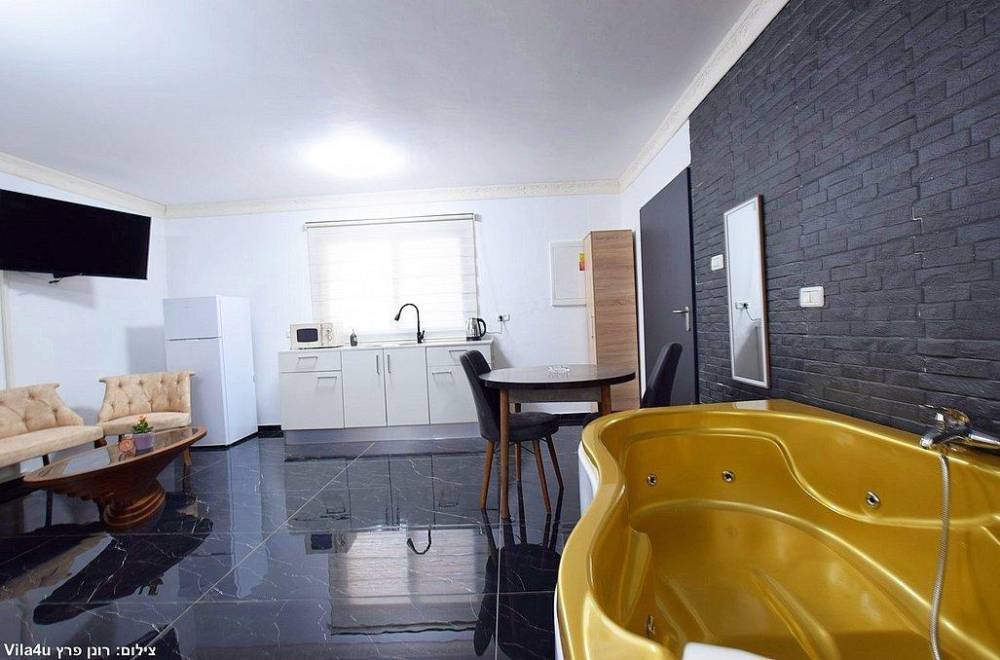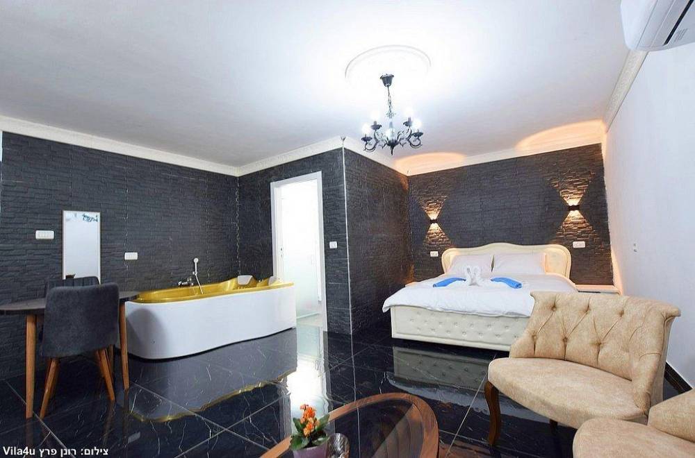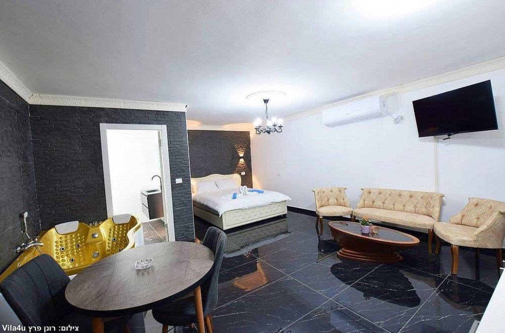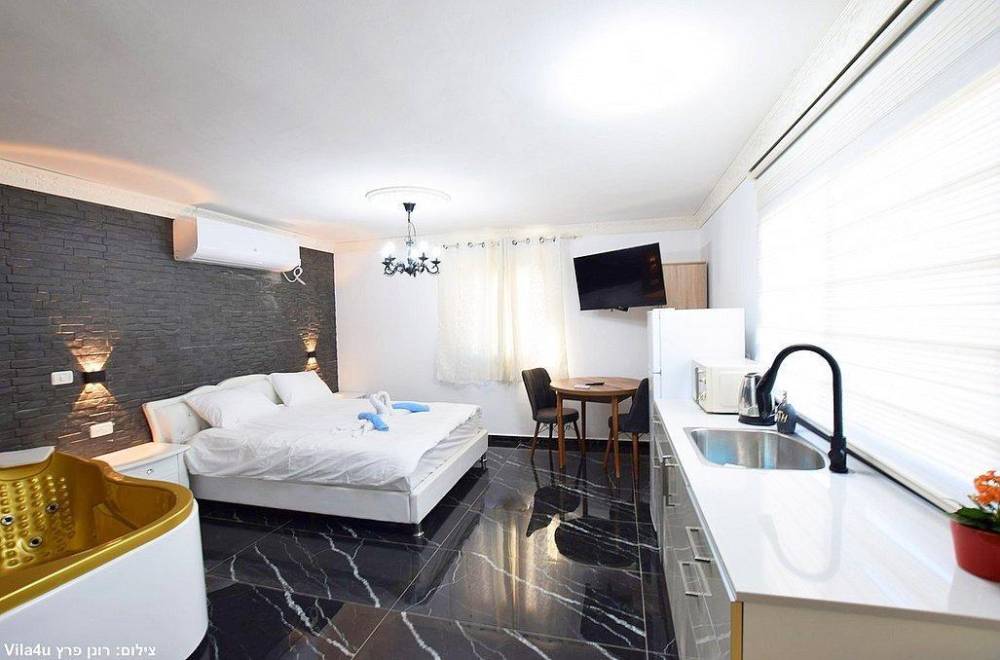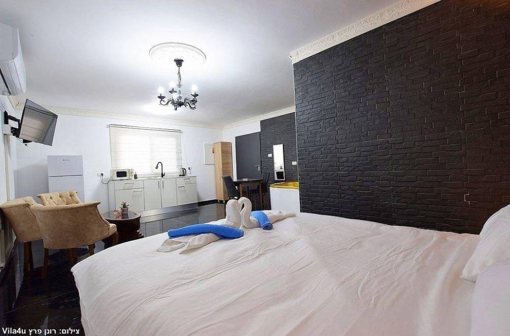 מיטה זוגית, ג'קוזי זוגי גדול, שידה וארון, מיזוג אוויר, מסך LCD עם חיבור להוט, פינת אוכל, מטבחון מאובזר, חדר רחצה פרטי הכולל מקלחון ושירותים