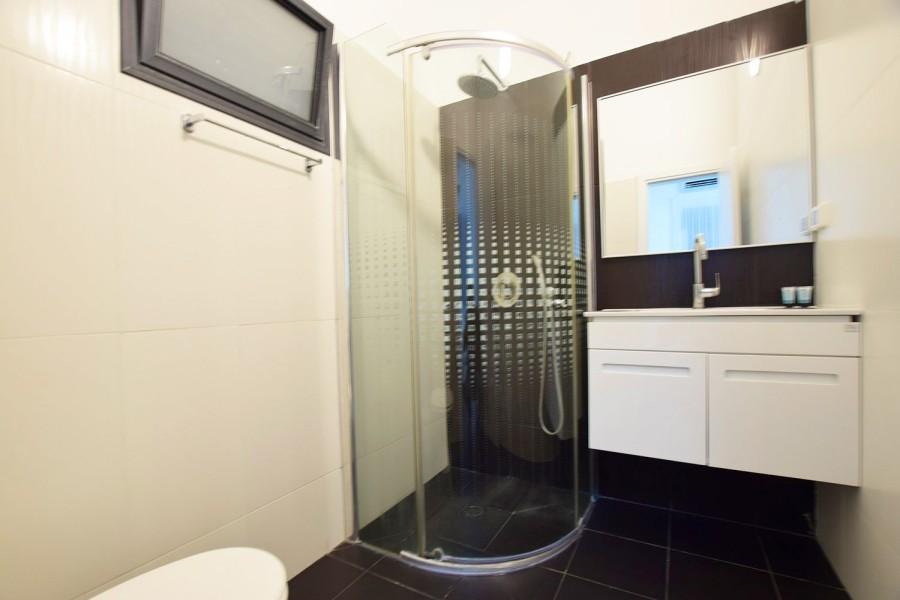 יחידת סטודיו עם מיטה זוגית, מזגן, מקלחת ושירותים.