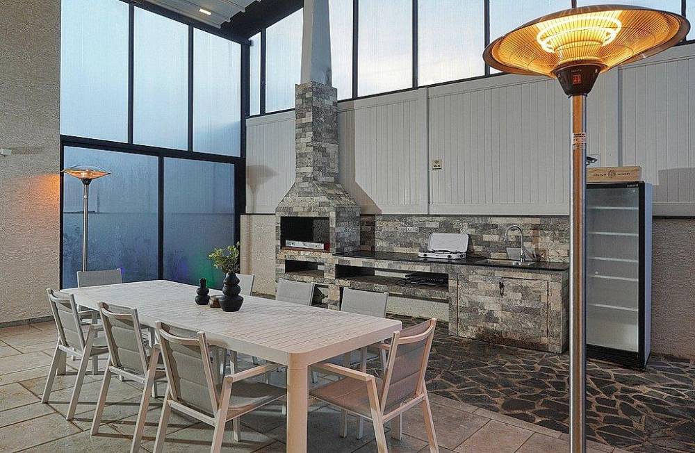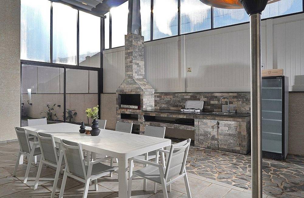 מטבח חיצוני מאובזר: מקרר, כיור, כירה על גז ופינת מנגל