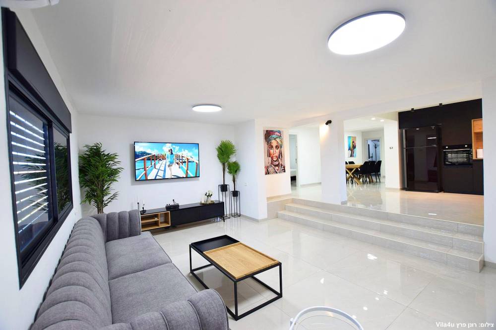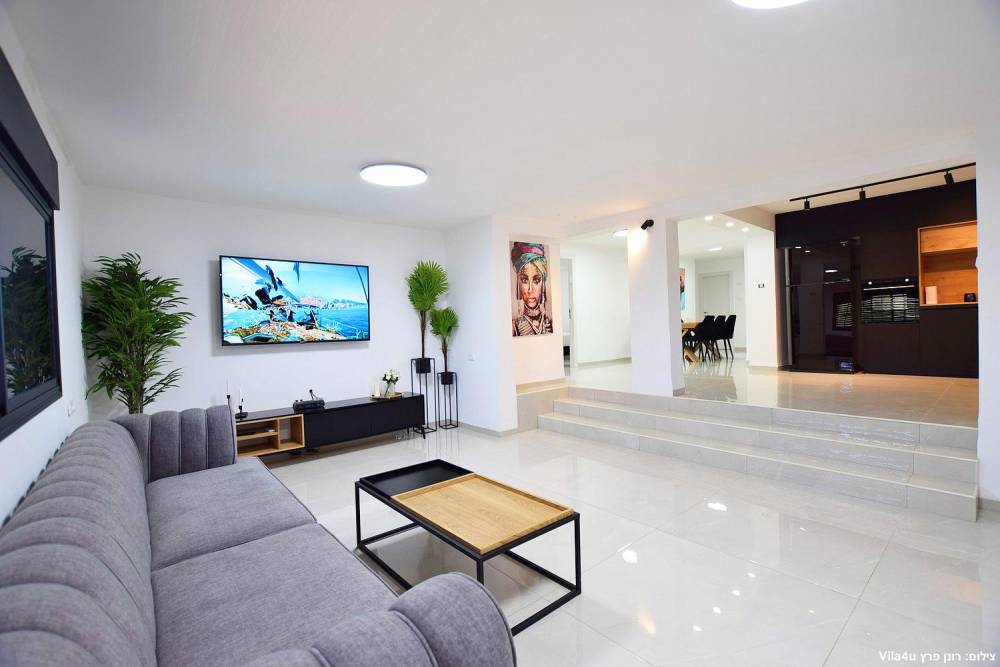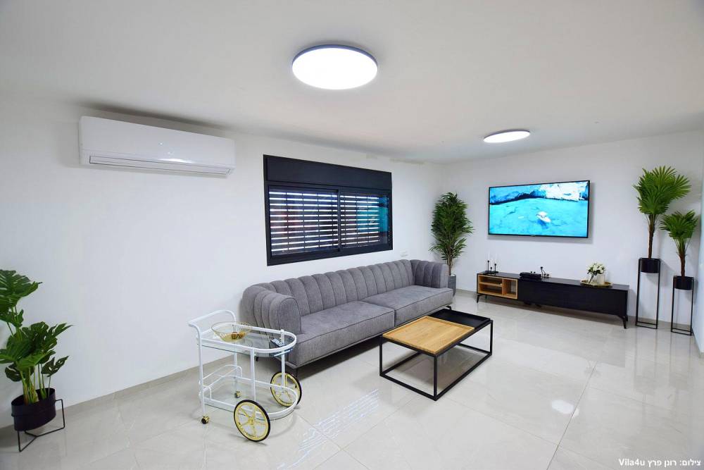 סלון מעוצב ברמה גבוהה עם טלוויזיה חכמה ומערכת ישיבה.