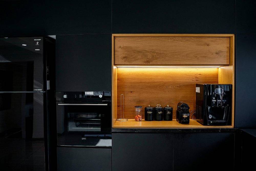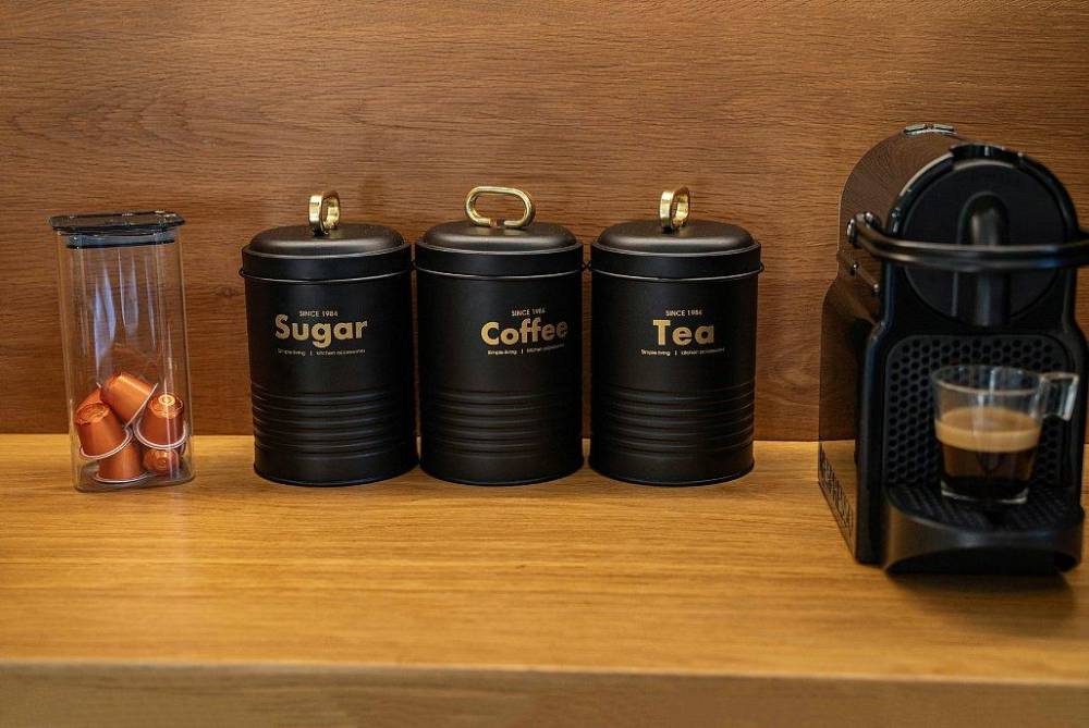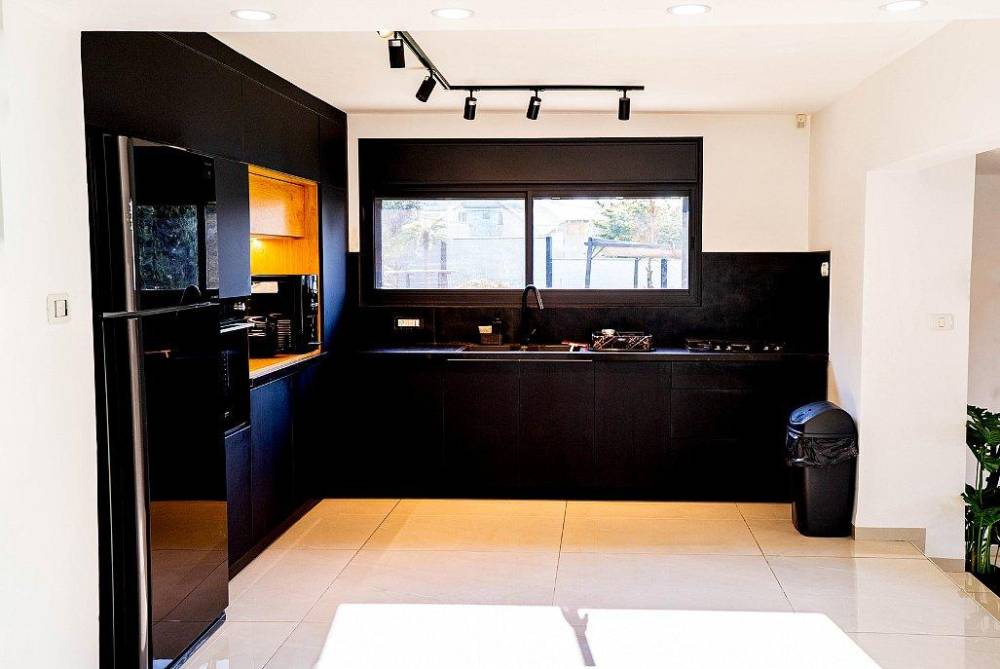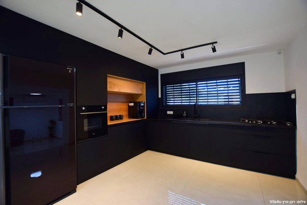 מטבח מאובזר הכולל כיריים גז, מקרר, תנור, מכשיר מים, מכונת קפה, פלטה ומיחם.