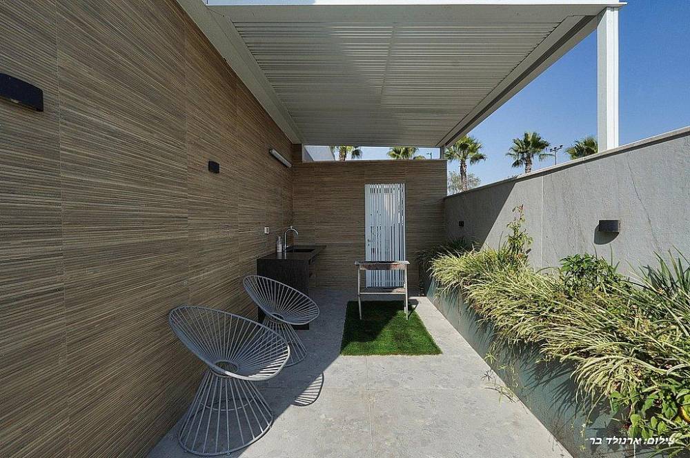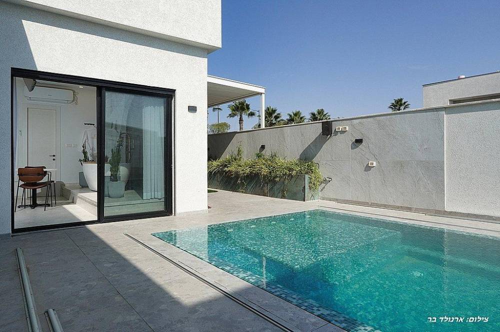 לחצר הוילה תצאו מהקומה הראשונה ושם תגלו חצר ענקית עם בריכת שחייה מחוממת בכל עונות השנה ומקורה בחודשי החורף, מוקפת באזורי ישיבה, מיטות שיזוף, בריכת נוי, תאורה לילית קסומה ומערכת הגברה, ושולחנות משחק: סנוקר ושולחן כדורגל שינעימו לכם את השהייה