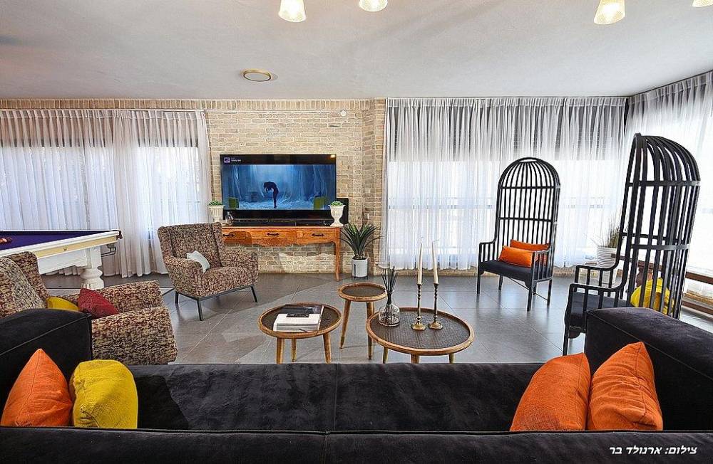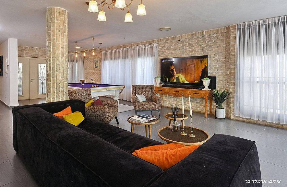 סלון מעוצב עם מערכת ישיבה מפוארת, טלוויזיה ומיזוג אוויר