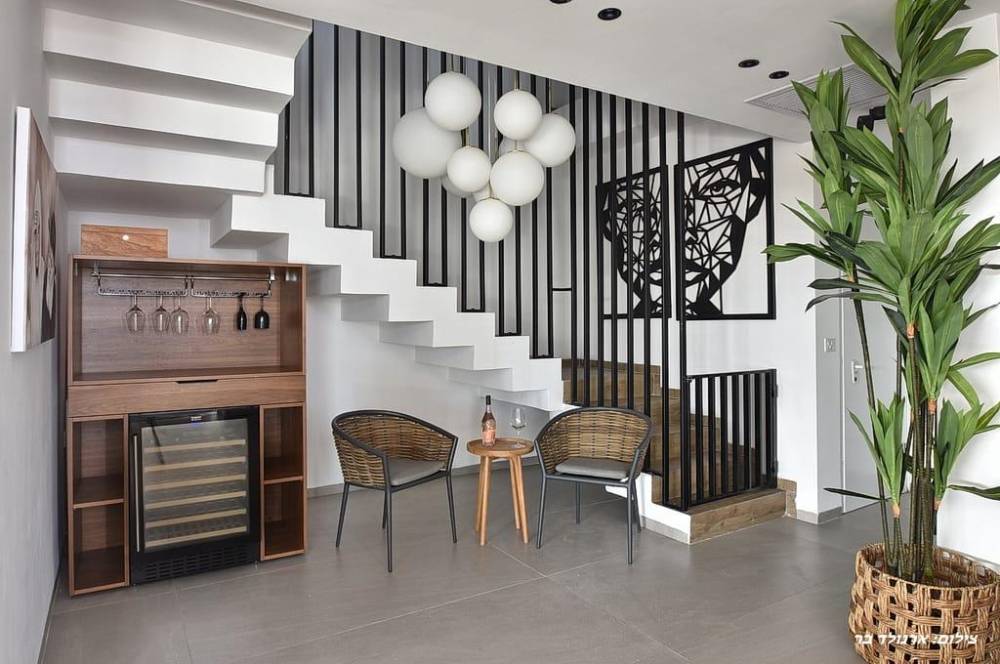 בנוסף, קיים פינת ישיבה עם מקרר יינות וכוסות יין.