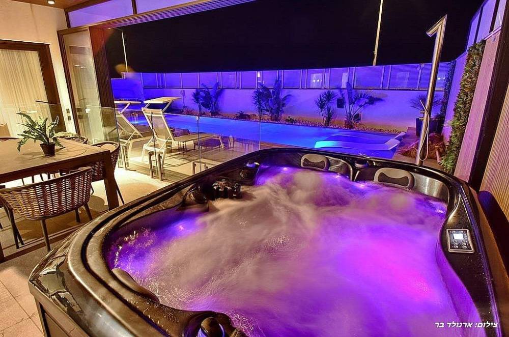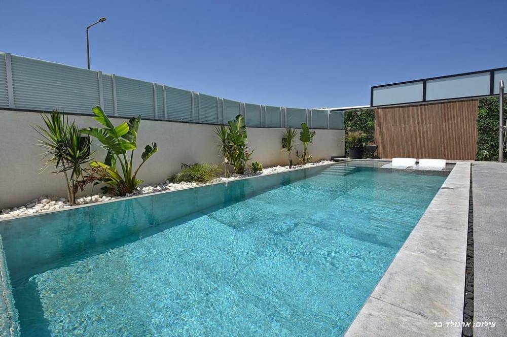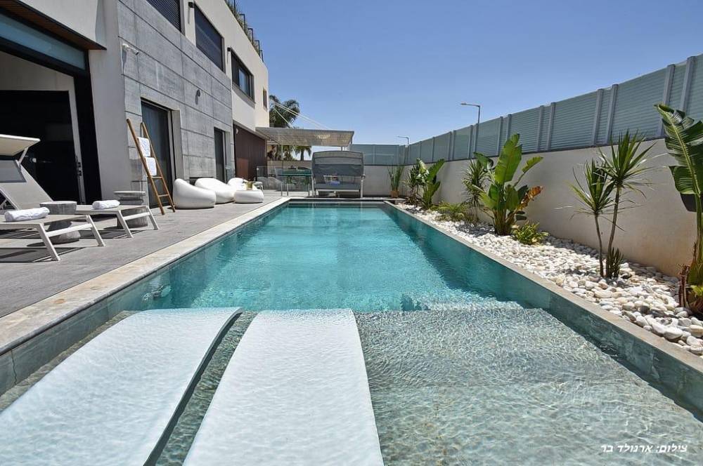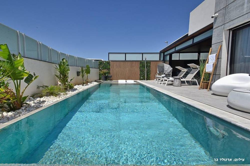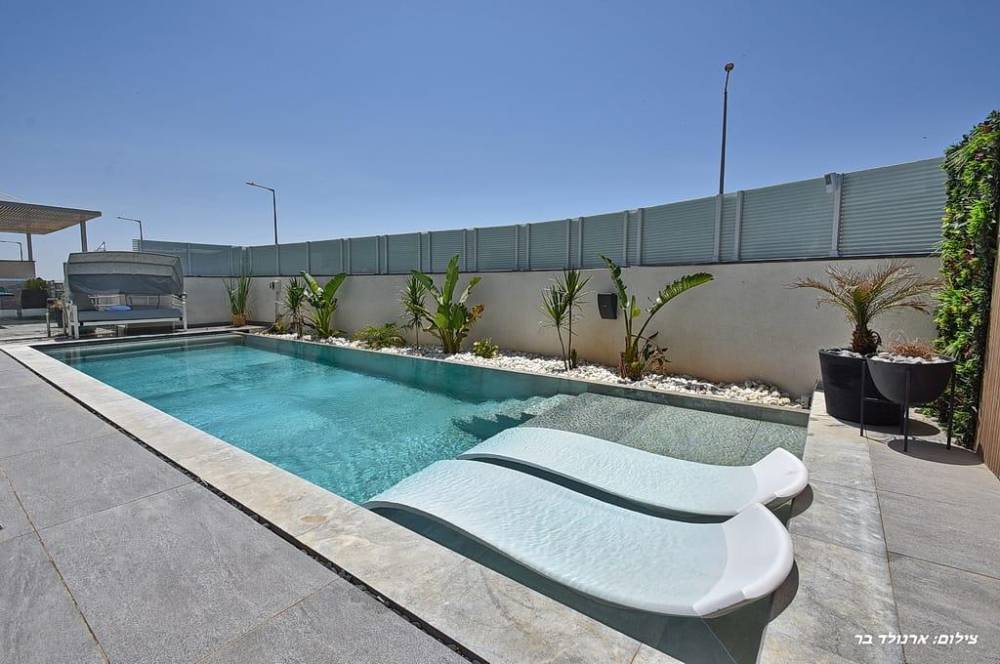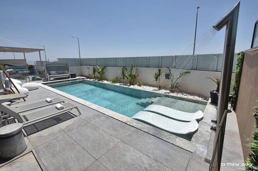 בריכת שחייה עם מיטות שיזוף ( מחוממת ומקורה בחורף )