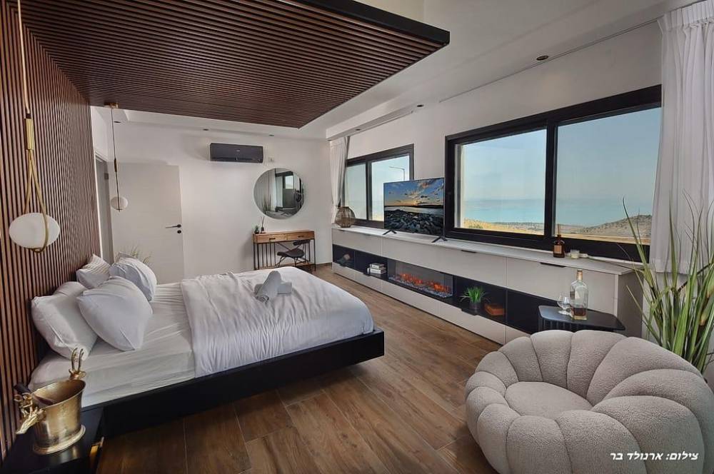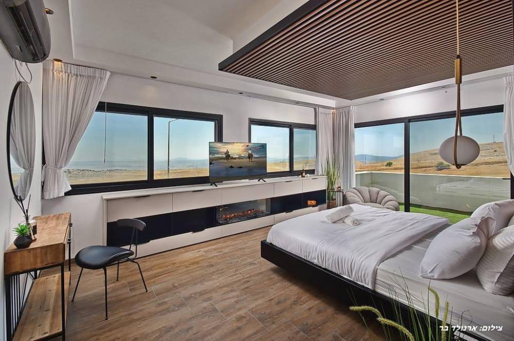מיטה זוגית צפה, שידות אחסון, מיזוג אוויר, פינת ישיבה, קמין חשמלי וטלוויזיה חכמה.