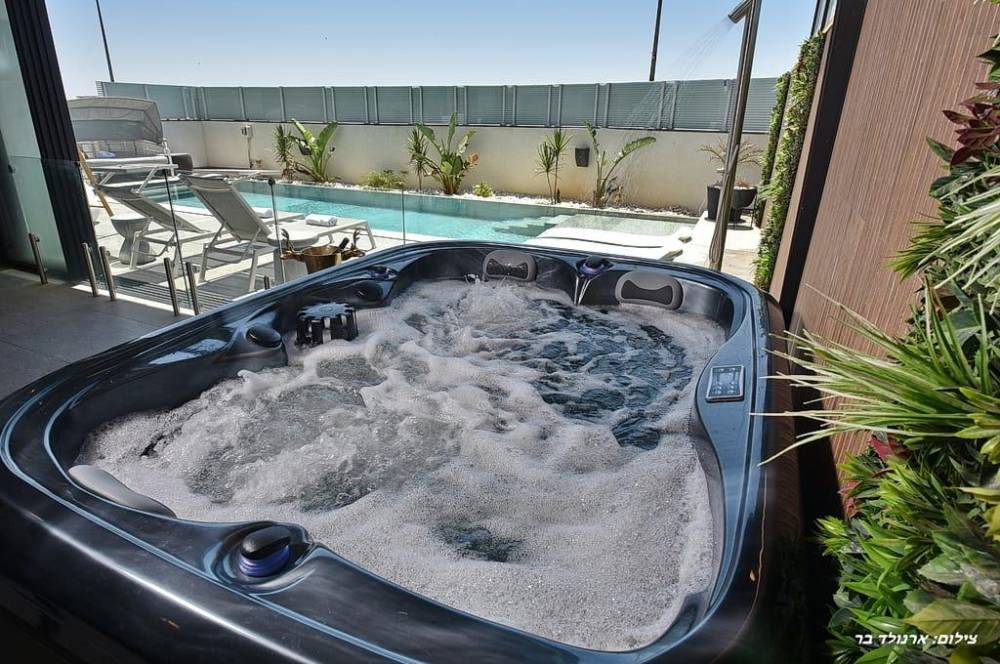 בריכת שחייה גדולה (מחוממת ומקורה בעונת החורף) ומסביבה מיטות שיזוף, פינות ישיבה ועוד.