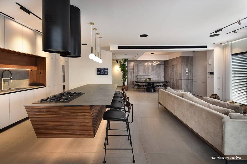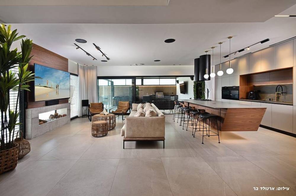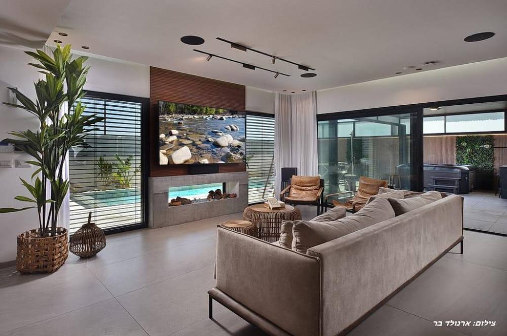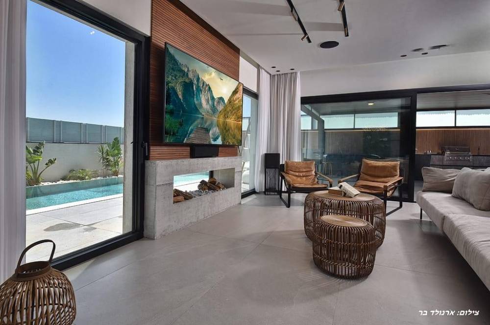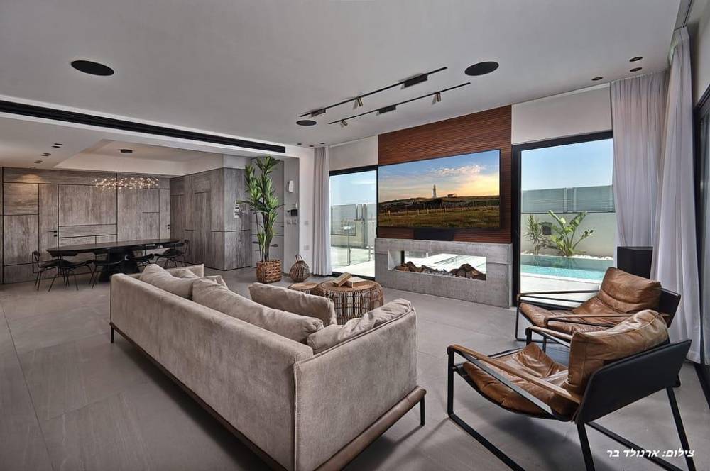 סלון עם ספה יוקרתית, כסאות מעוצבות, מערכת שמע וטלוויזיה חכמה גדולה.