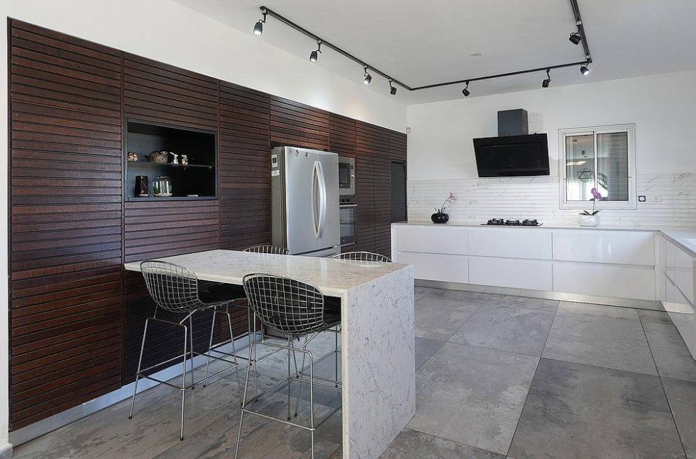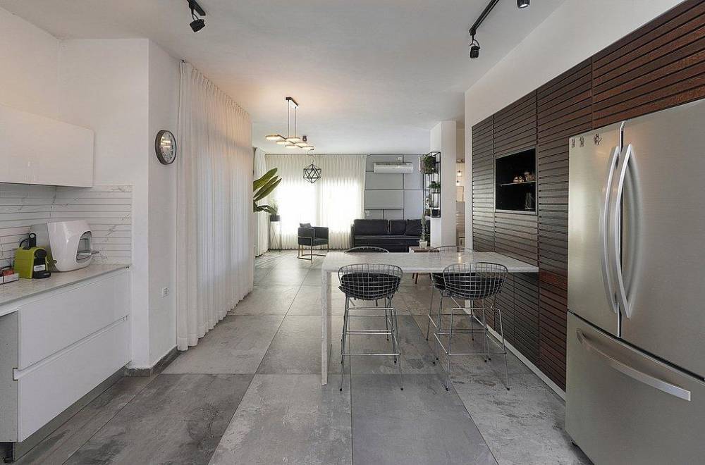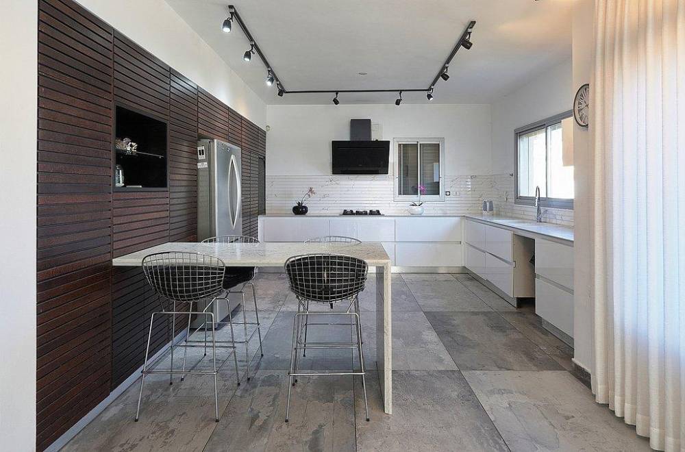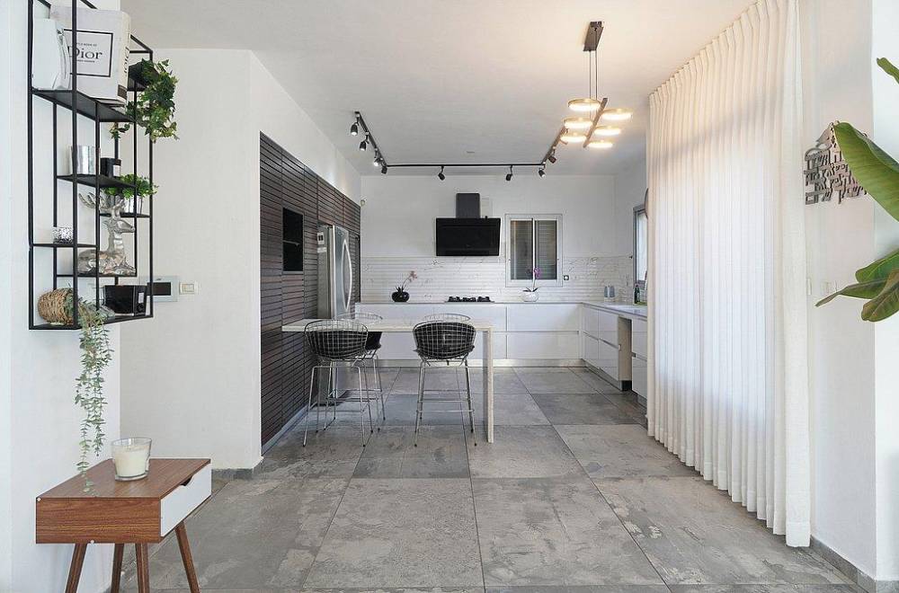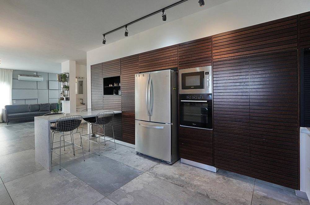 מטבח מאובזר הכולל מקרר, כיור, תנור אפייה, מיקרוגל, תמי 4, כלי אוכל והגשה