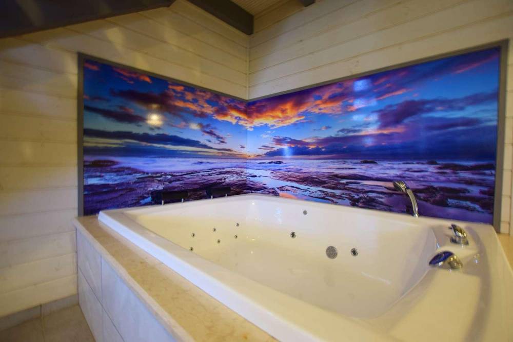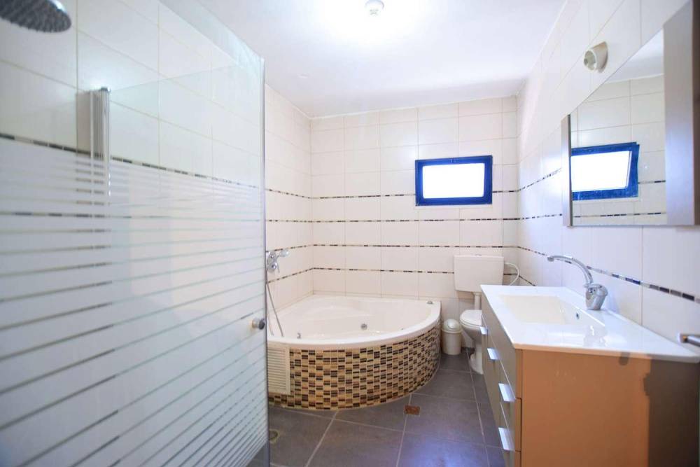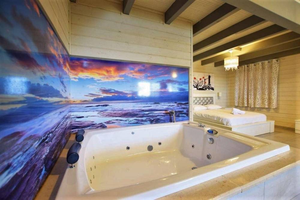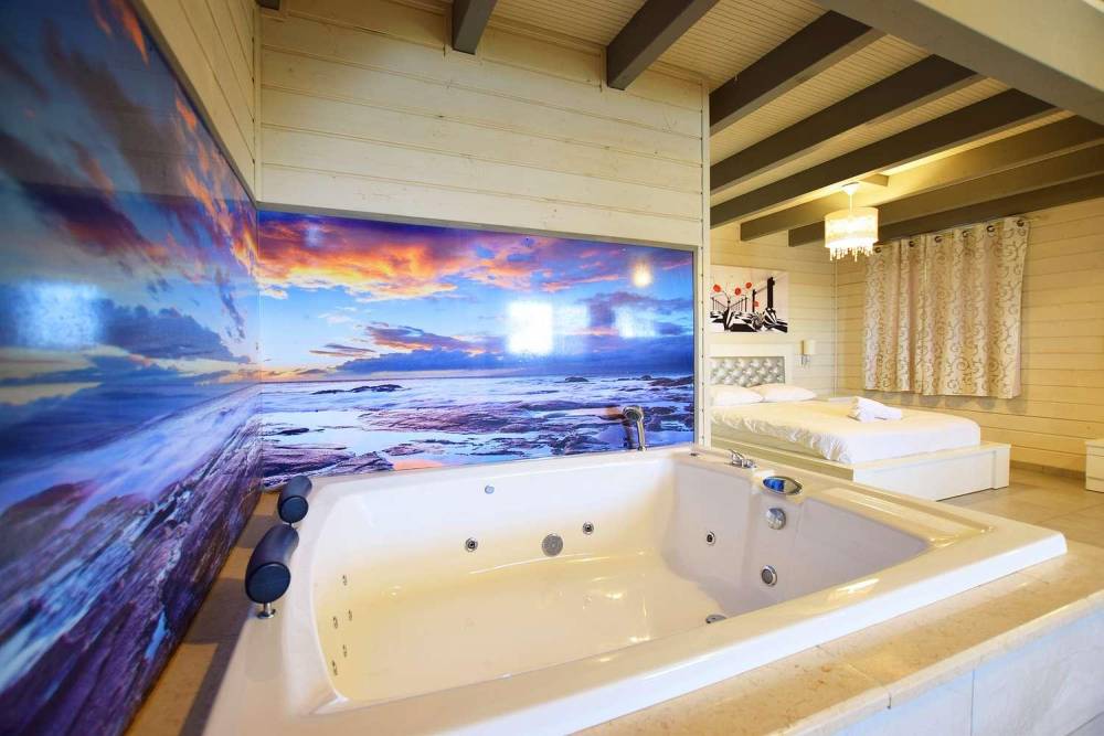 חדר רחצה עם אמבט ג'קוזי, מגבות רחצה וסבונים