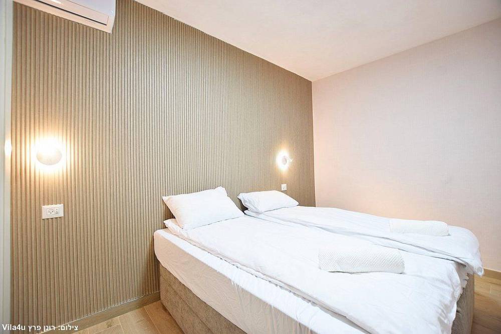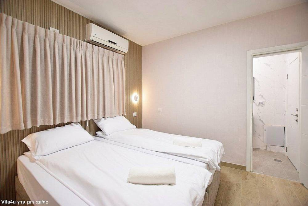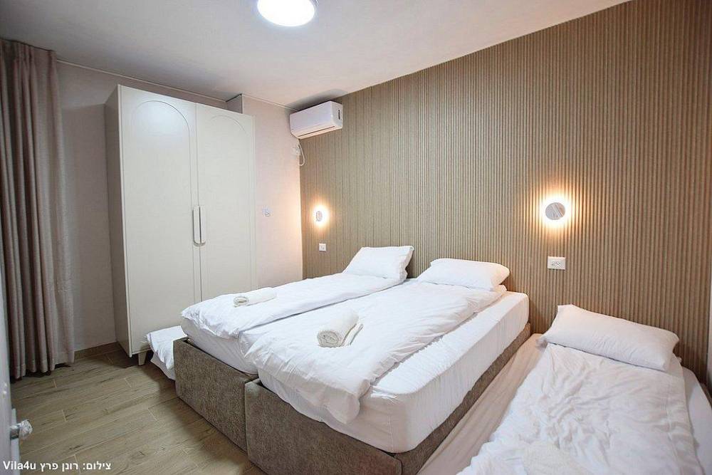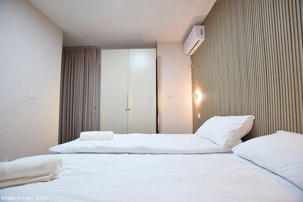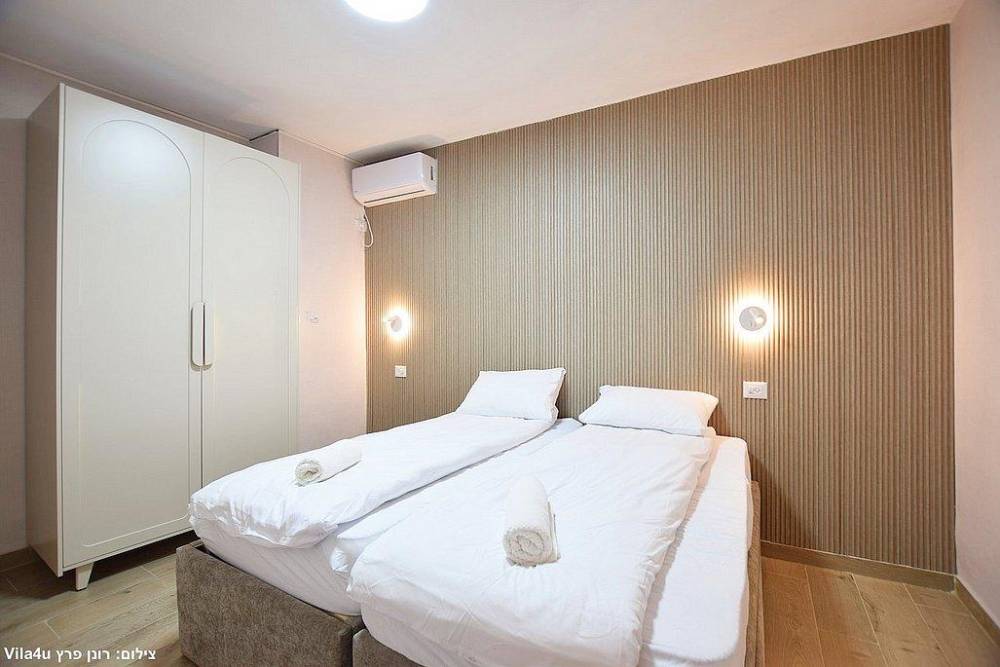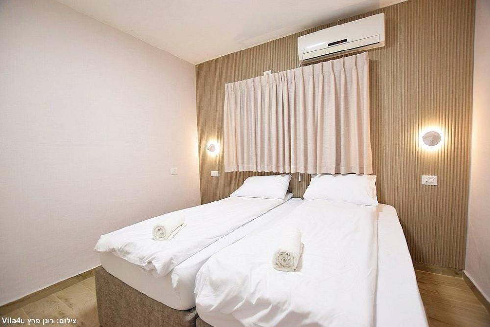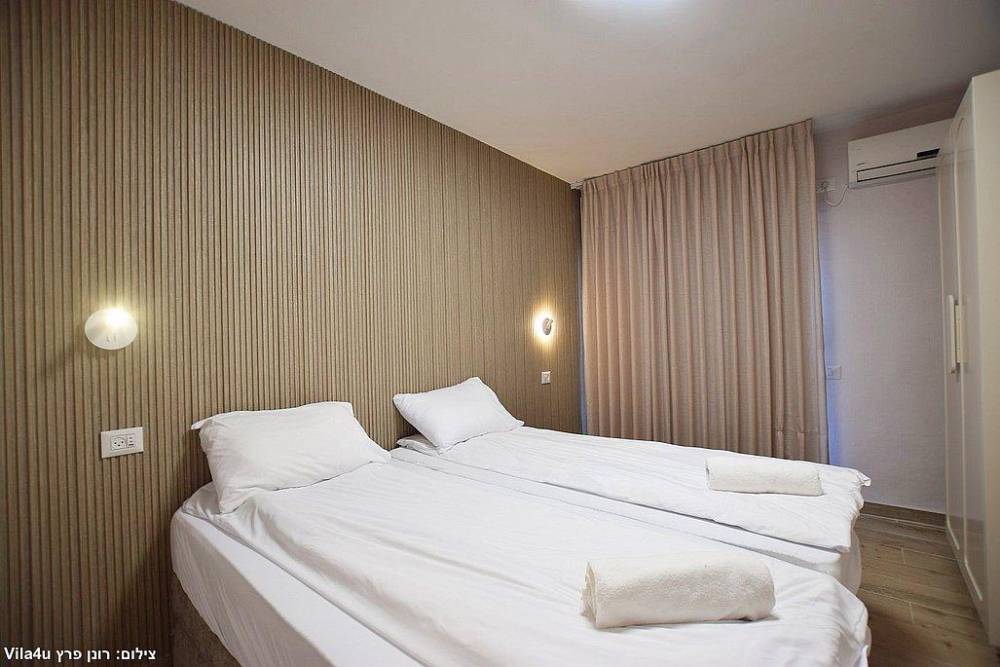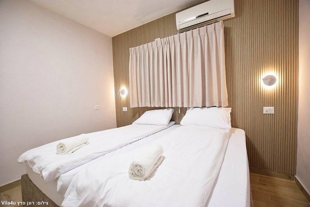 - אבזור החדרים: כל חדר מכיל מיטה זוגית עם מצעים איכותיים, מגבות, שידות וארונות לאחסון, וילות הצללה, תאורת שבת ומיזוג אוויר.