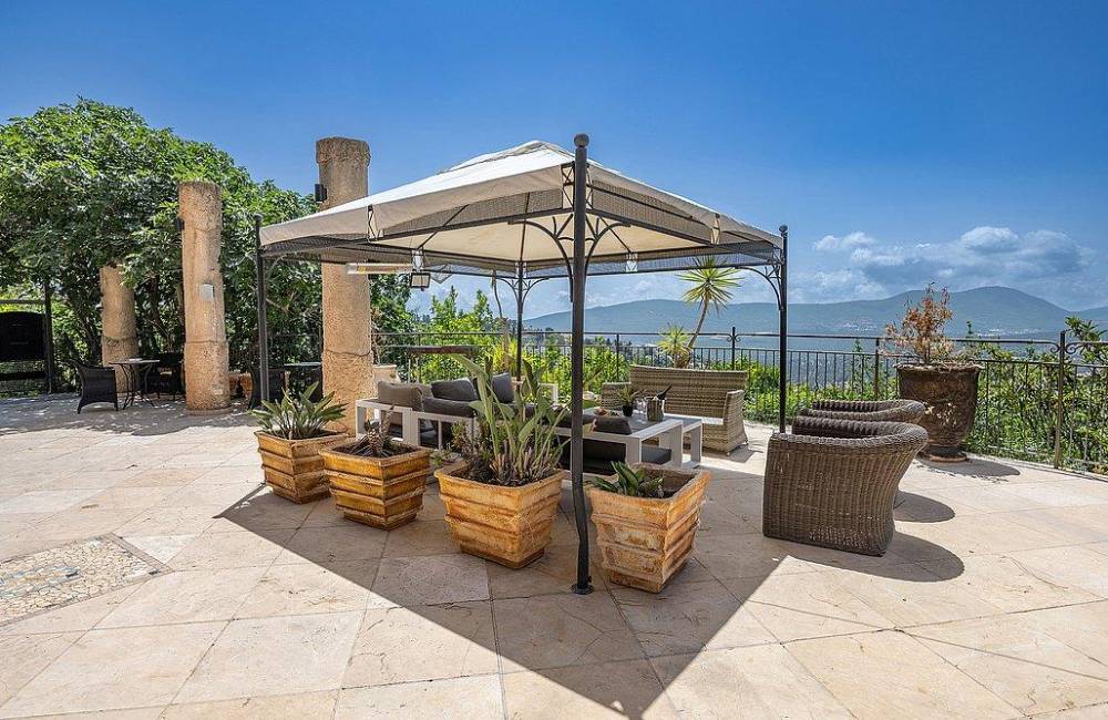 - פרגולה רחבה עם פינות ישיבה, ערסלים, סלון חוץ