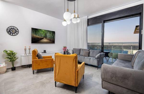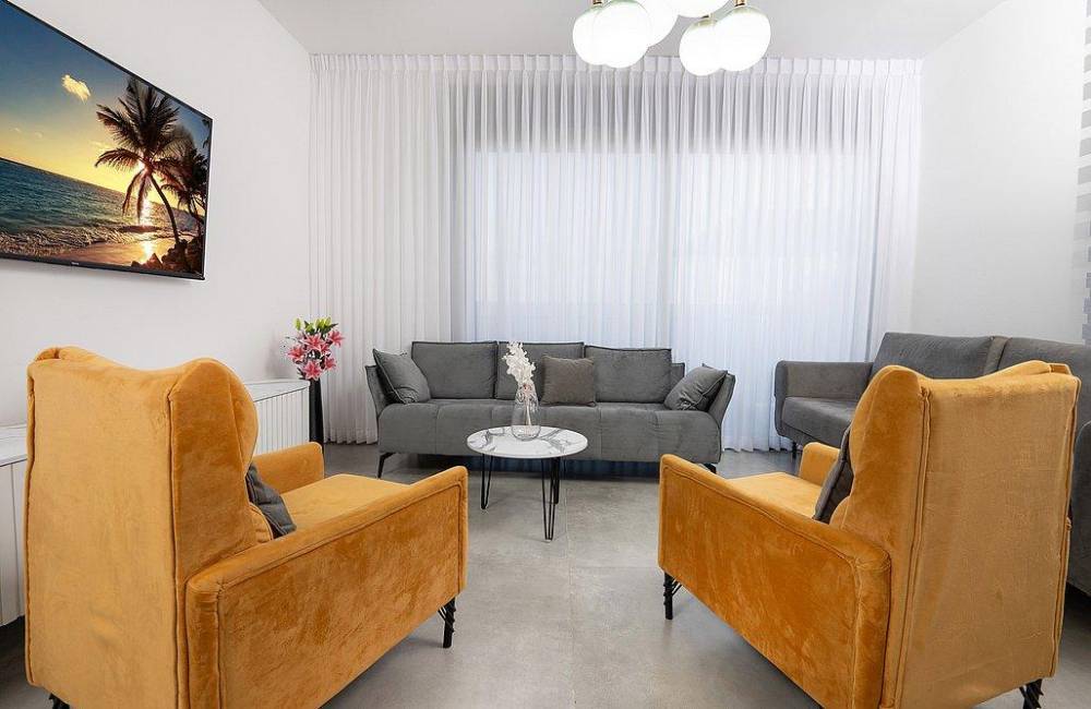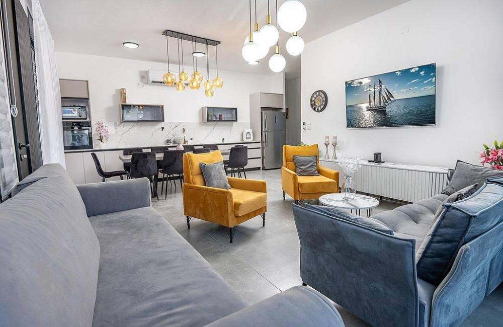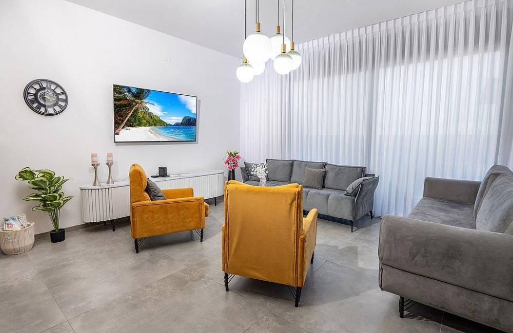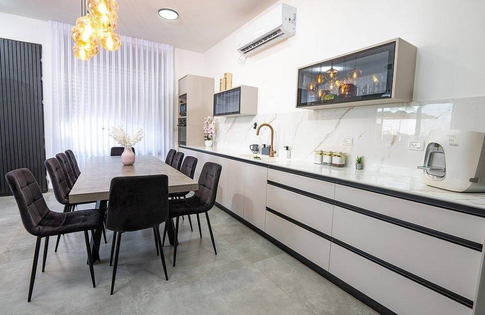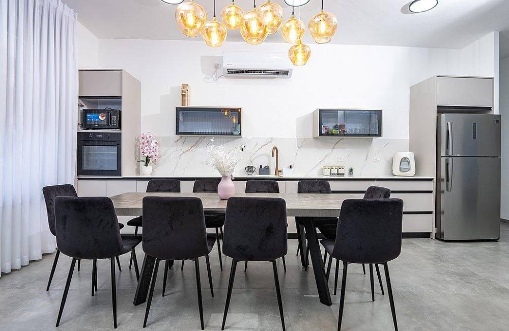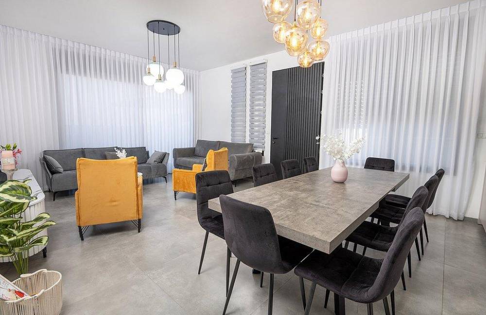 סלון גדול עם מסך 75 אינץ’ וחיבור ל- Hot לצידו פינת אוכל יוקרתית