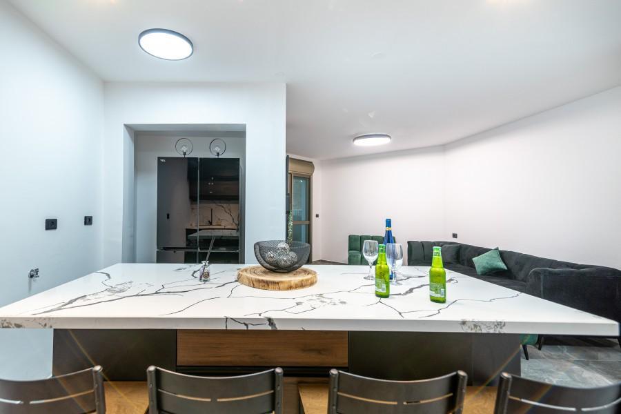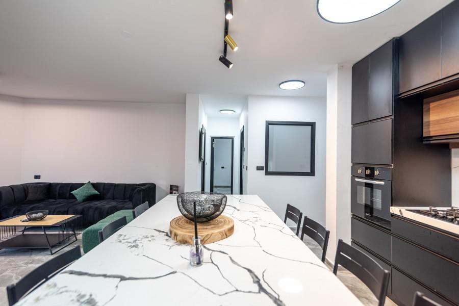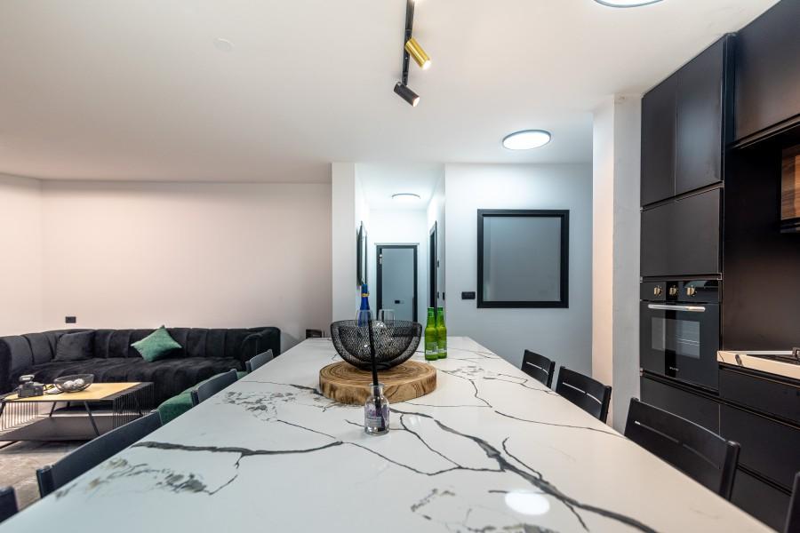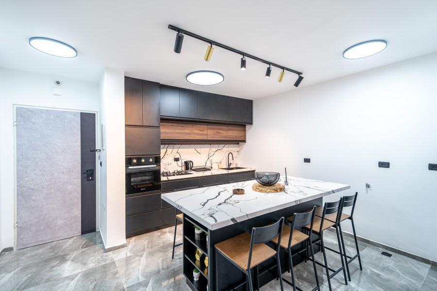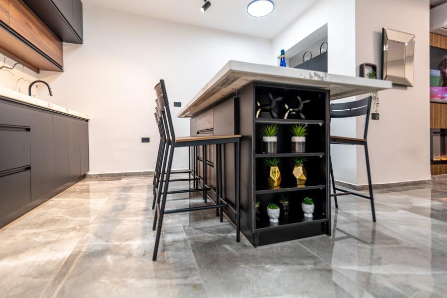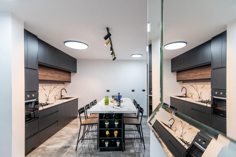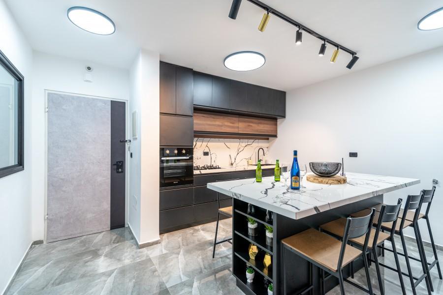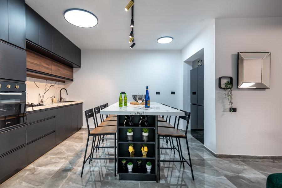 מטבח מאובזר הכולל: מכונת אספרסו, מקרר גדול, תנור אפייה, מיקרוגל, קומקום חשמלי, כיריים, כלי אוכל והגשה.