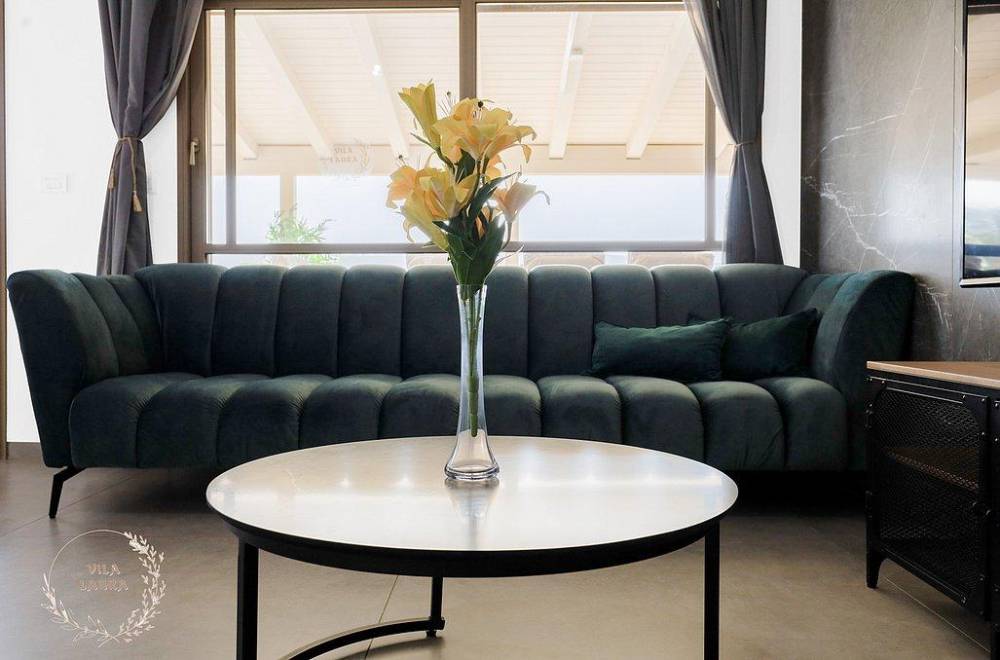 סלון מעוצב ומרווח עם מערכת ישיבה יוקרתית וטלוויזיה