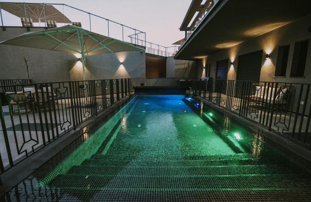 בריכת שחייה (מחוממת) מגודרת מידות: 12 על 4 מטר, עומק מקסימלי: 1.5 מטר
