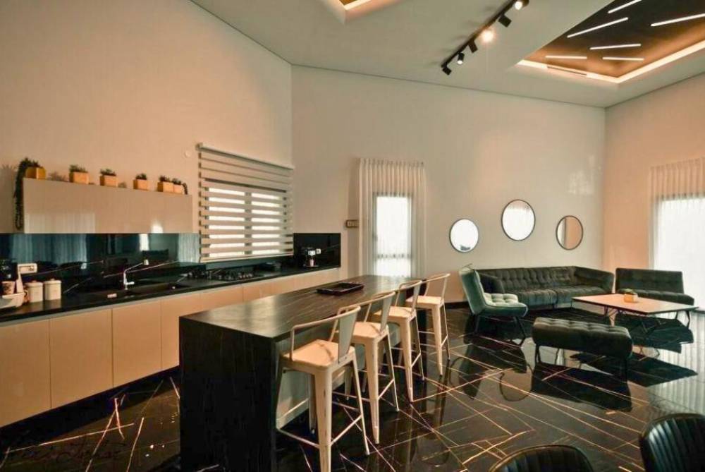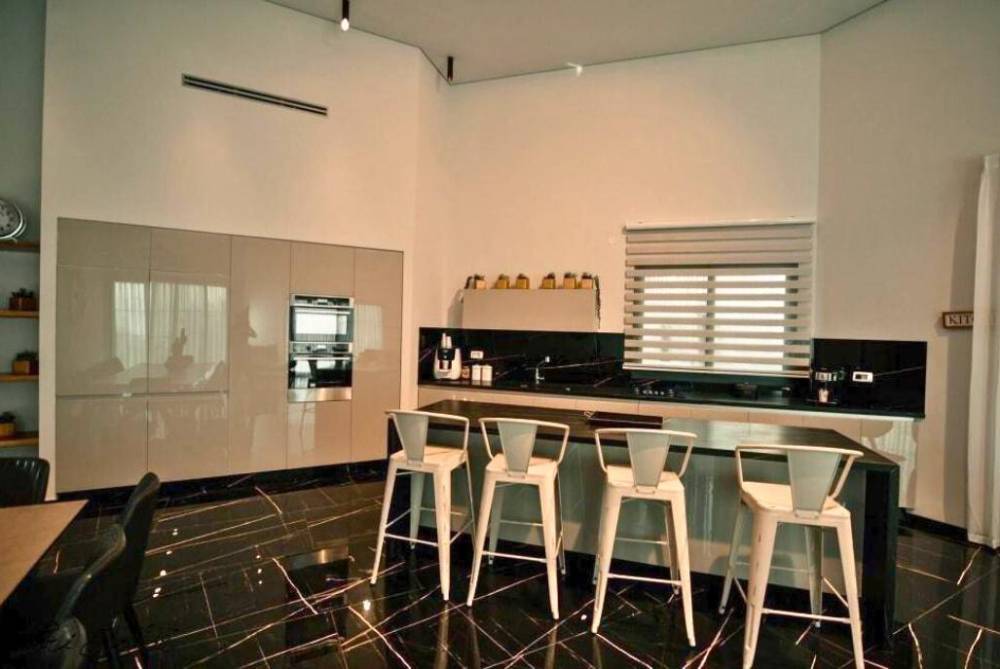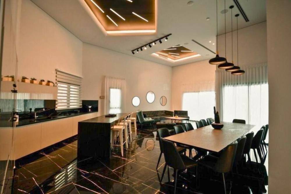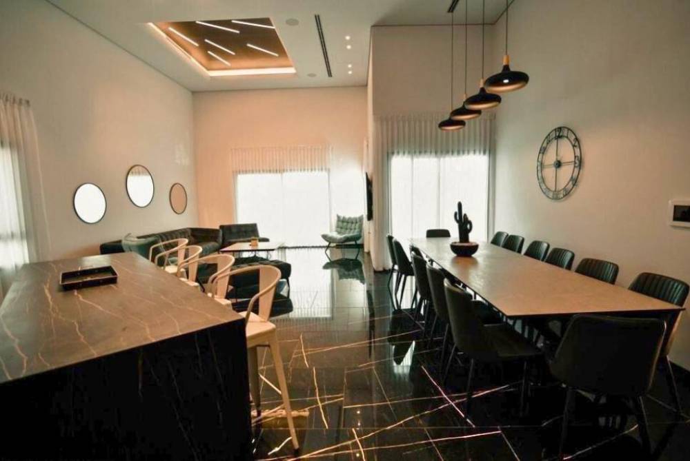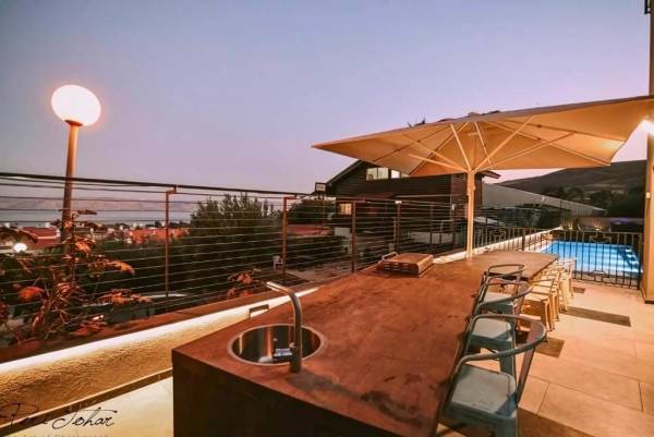 מטבח חיצוני מאובזר הכולל: עמדת BBQ גדולה שולחן אוכל גדול ומקרר