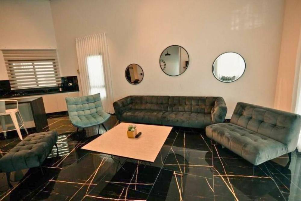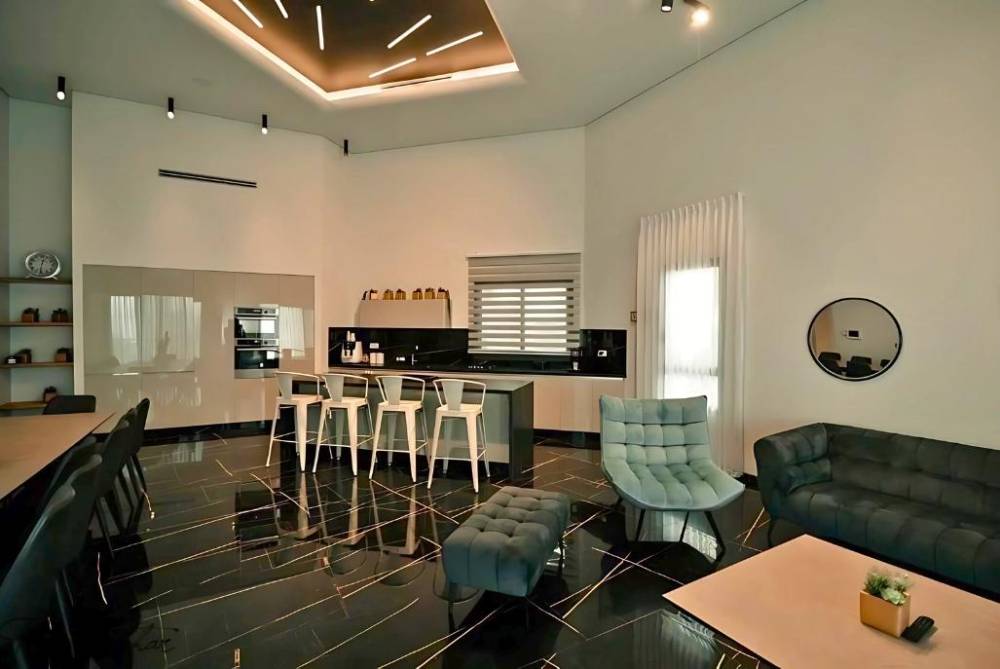 סלון מרווח הכולל פינת ישיבה + טלוויזיה חכמה עם חיבור לכבלים ולמערכת קולנוע ביתית