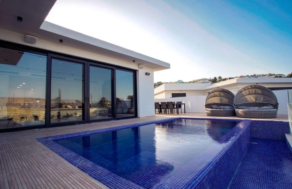 בריכת שחייה בנויה מחוממת ומקורה בגודל 3.5X7.5 מטר ועומקה המקסימלי 1.80 מטר